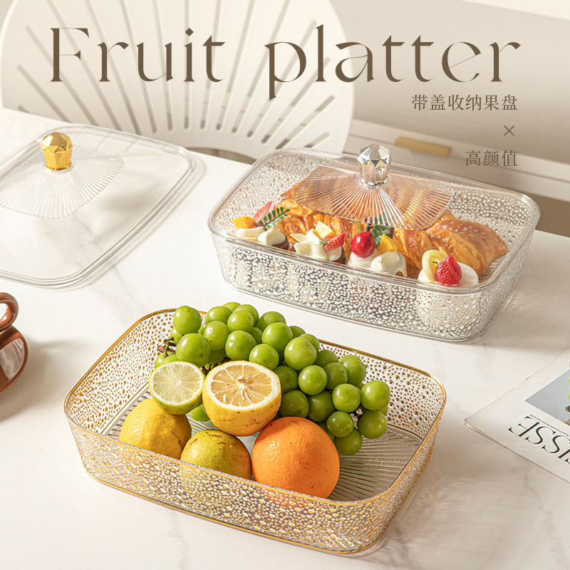 透明長方形蓋付き金辺果物皿プラスチックPETデスクトップ皿ホテル整理雑物収納ケース