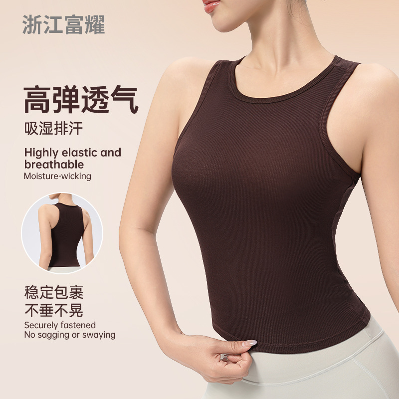 リブラウンドネックスポーツベスト女性用胸パッド付き多用途スリムヨガトップピラティスノースリーブヨガ服