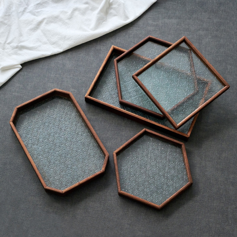 中国風レトロ長方形家庭用茶盆、茶器・水杯収納飾り、木製ガラス製フルーツ・軽食トレイ