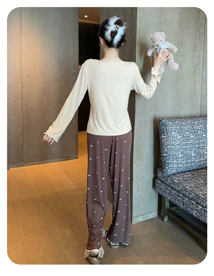 オーミダ春秋新作長袖パジャマ女性用モダールリボンレースセット胸パッド付きホームウェア