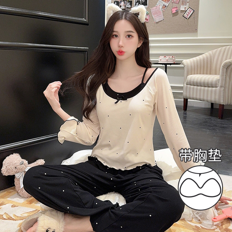 オミダ春長袖モダールパジャマ 女性用 胸パッド付き 水玉模様 フェイクツーピース ホームウェア 外出着としても着用可能