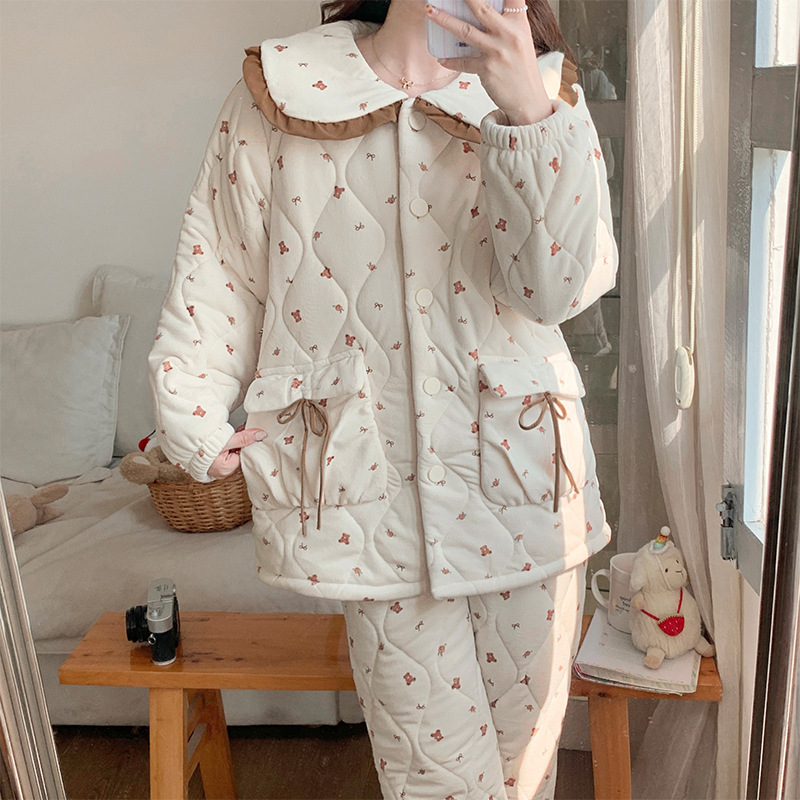 喔密哒三层夹棉睡衣女冬季小熊印花珊瑚绒加绒加厚保暖家居服套装