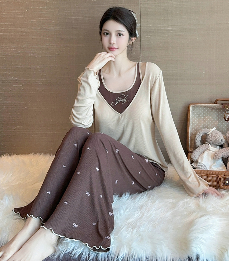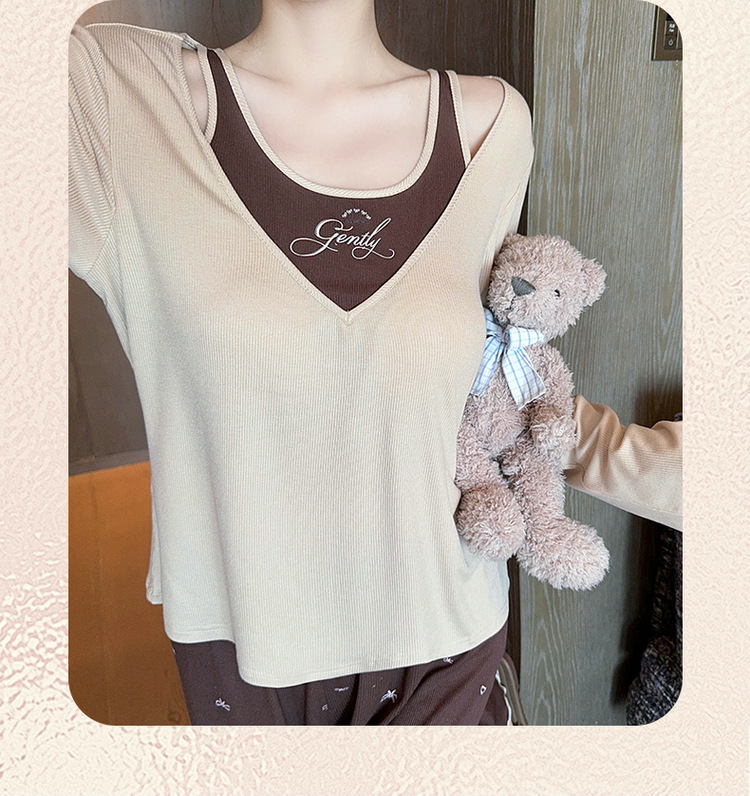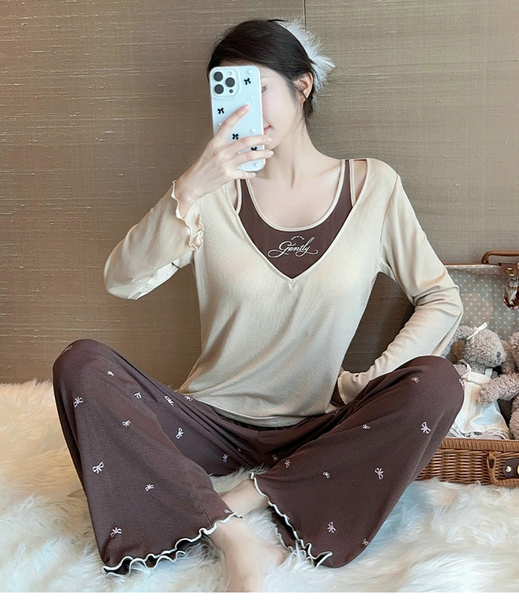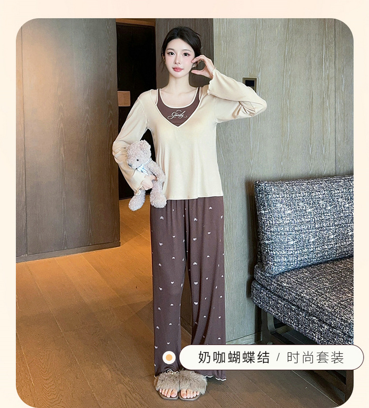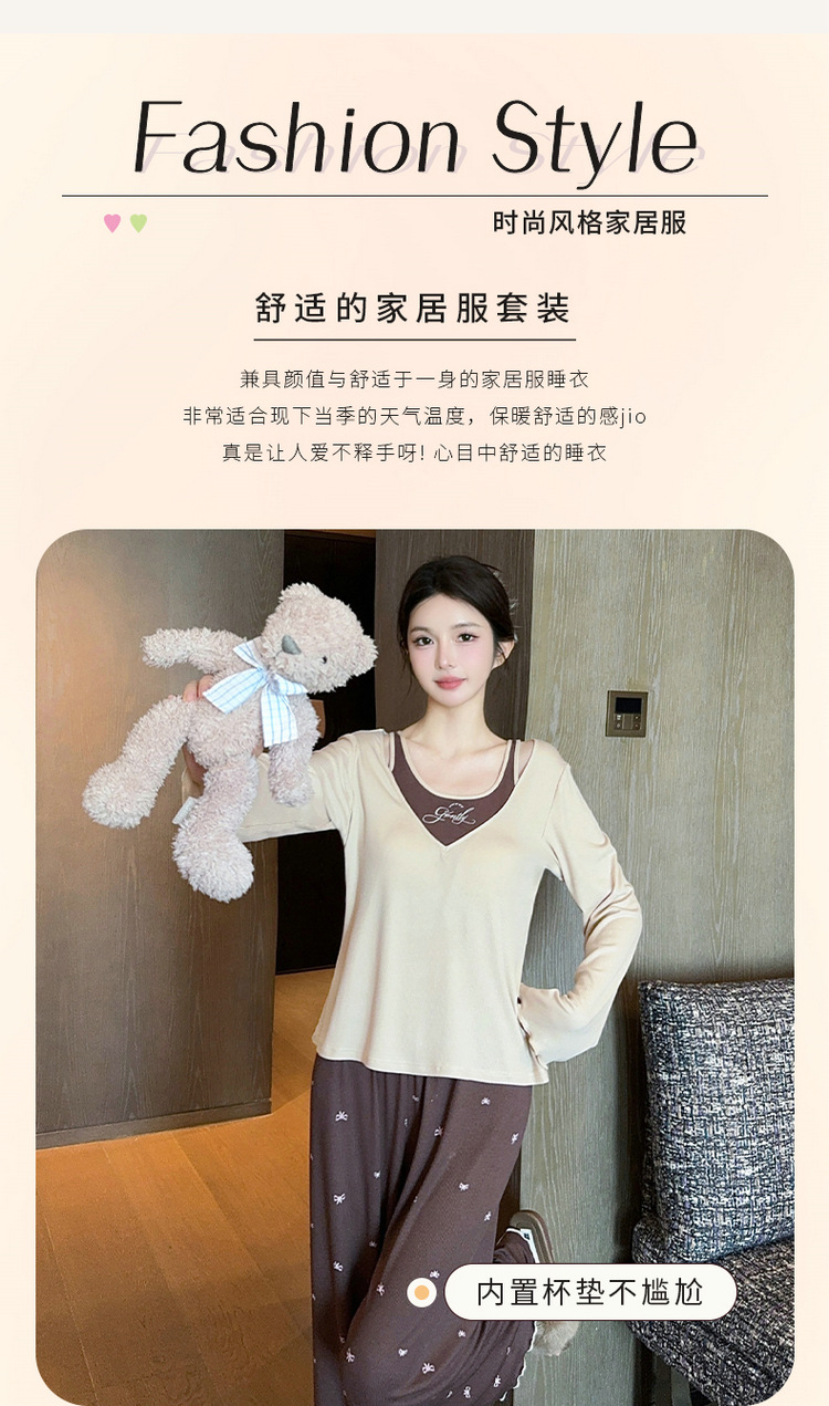 春夏の女性の純粋な欲望スタイルのレーヨンモーダル偽ツーピース胸パッド付きホームウェア長袖ズボンパジャマ