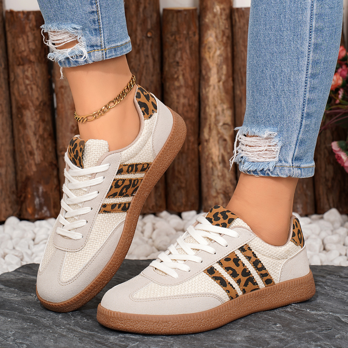 2025 夏の新スタイルレースアップラウンドトゥ通気性ヒョウ柄フラットカジュアル多用途軽量快適な靴女性のための卸売