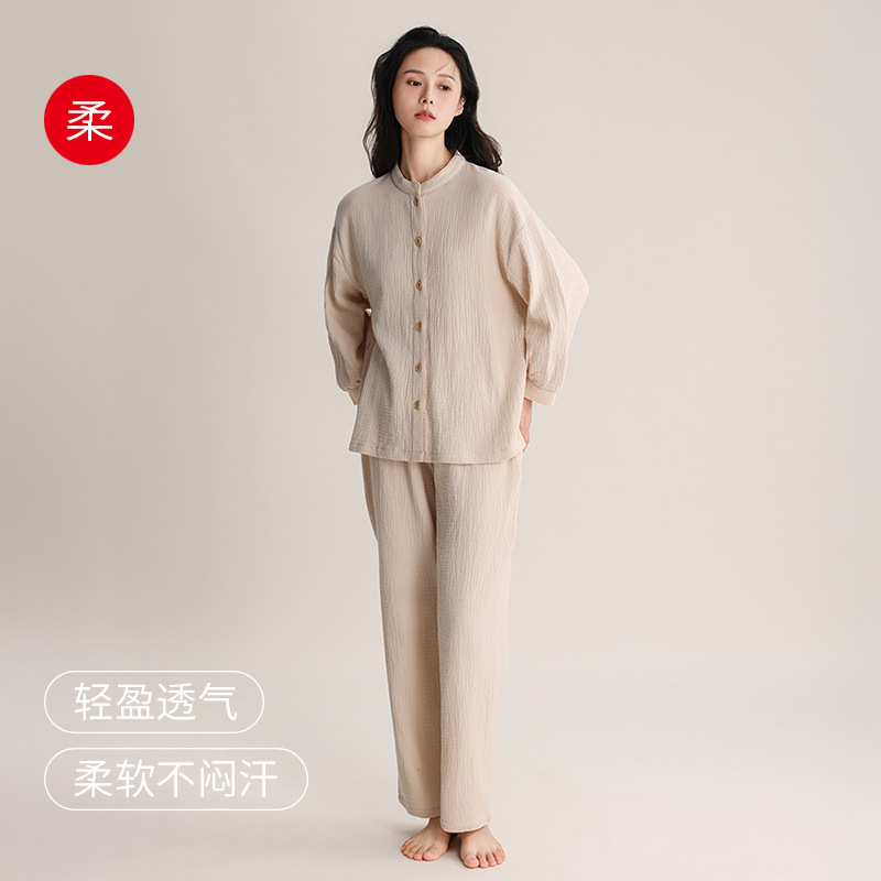 春夏レディースパジャマ二重クレープ立ち襟九分袖長ズボンシンプル日系無印風ホームウェアセット薄手