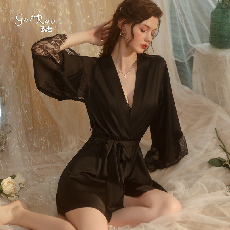 DZバラのような広い襟のベルトのサテンのフォークのひものレースのつづりの長いパジャマのバスローブのセット19960
