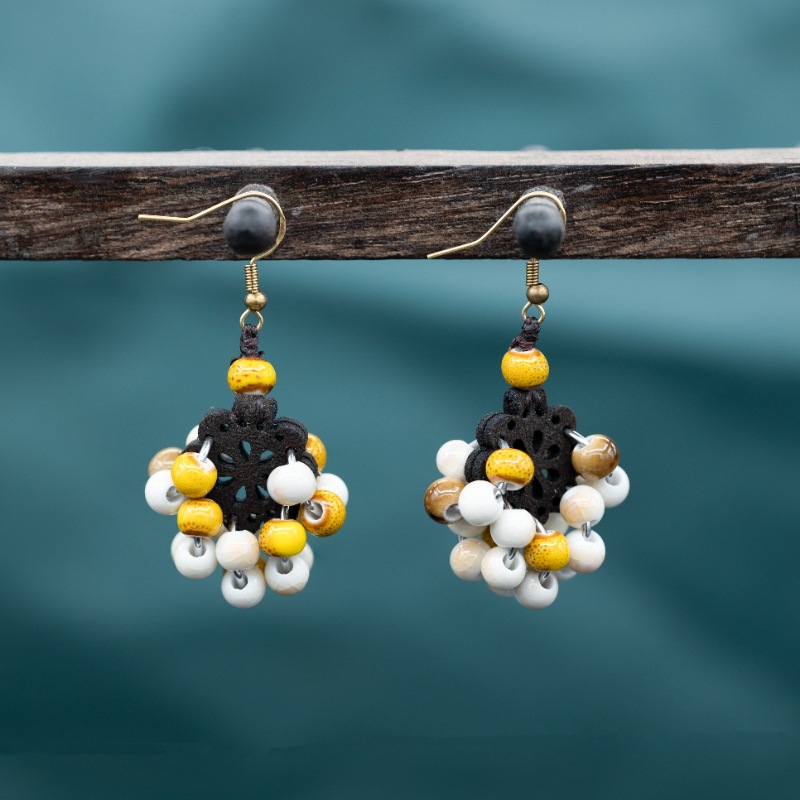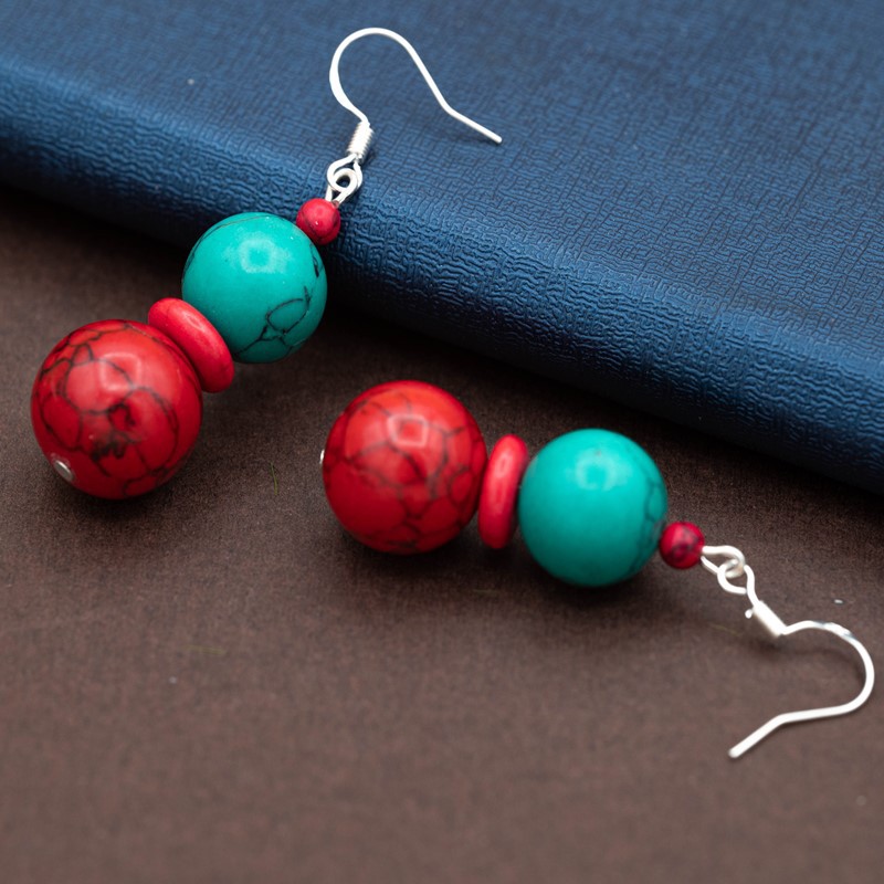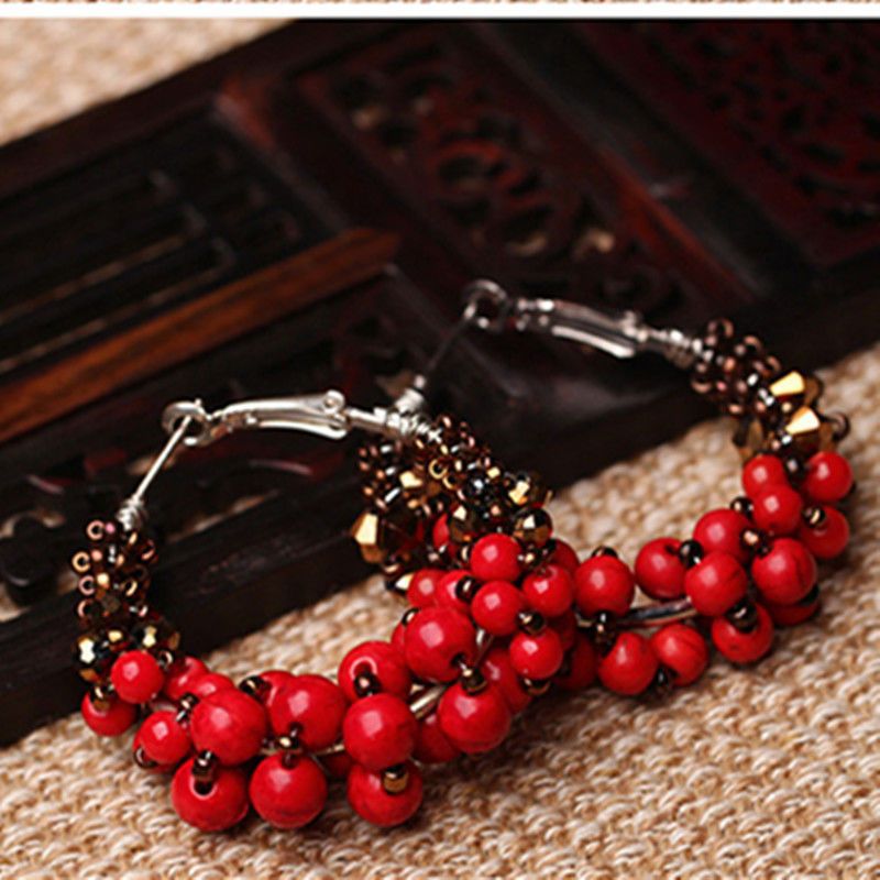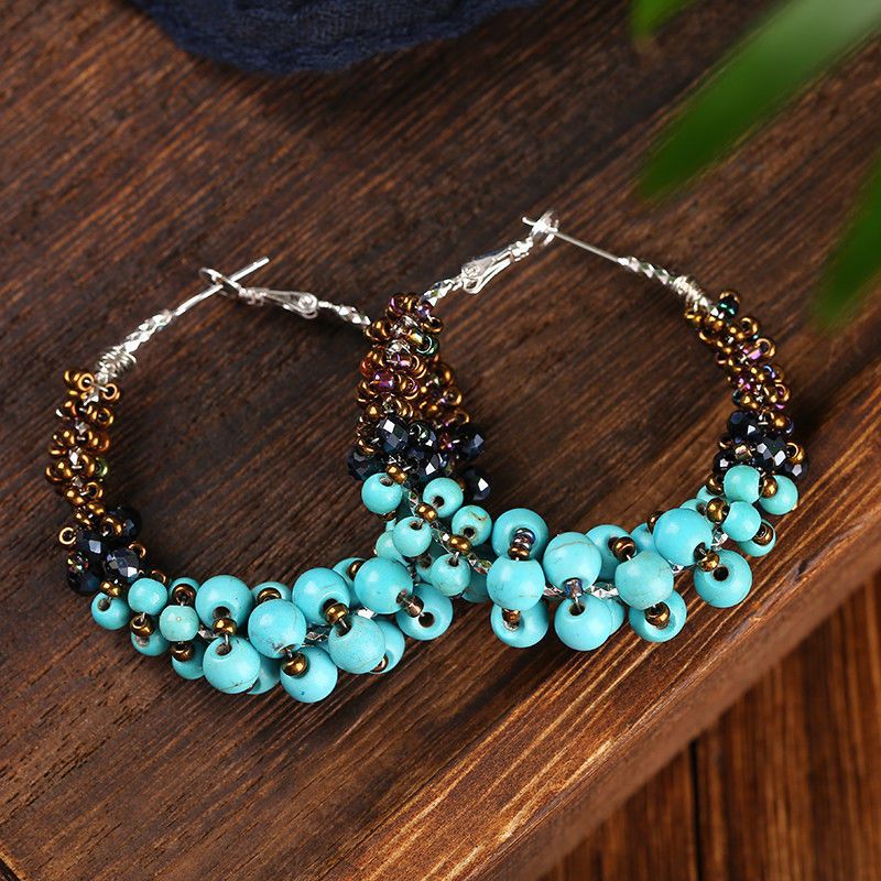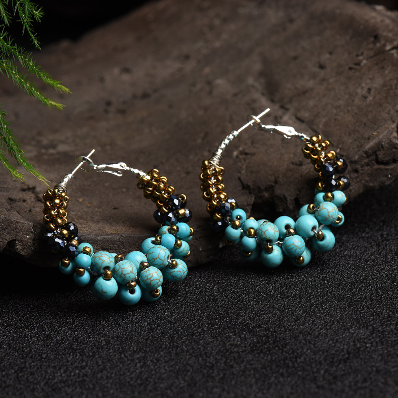 メーカー直販雲南民族風アクセサリーボヘミアン緑松石米珠イヤリングレトロ苗銀個性イヤリング