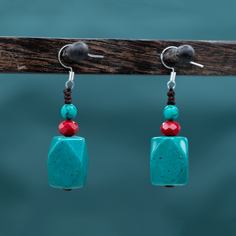 銅メッキ925銀緑松石イヤリング民族風切断面耳打ち手作りファッションシンプル気質アクセサリーチベット式女性