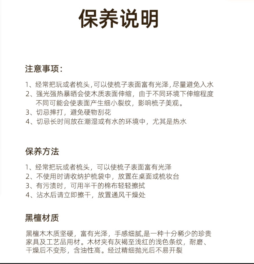 1:木梳子,不可水泡,不能吹风机对吹,以免实木热胀冷缩开裂变形。木梳忌,忌泡水,忌暴晒。