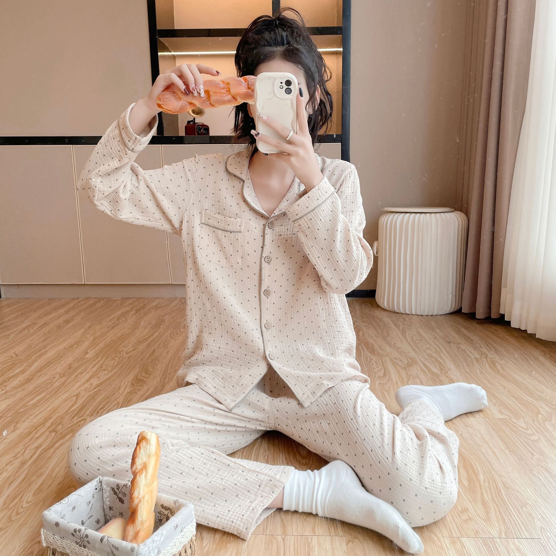 女性の純綿糸秋長袖パジャマ女性のバブル綿糸ラウンドネック水玉小さな新鮮なルーズホームウェアセット