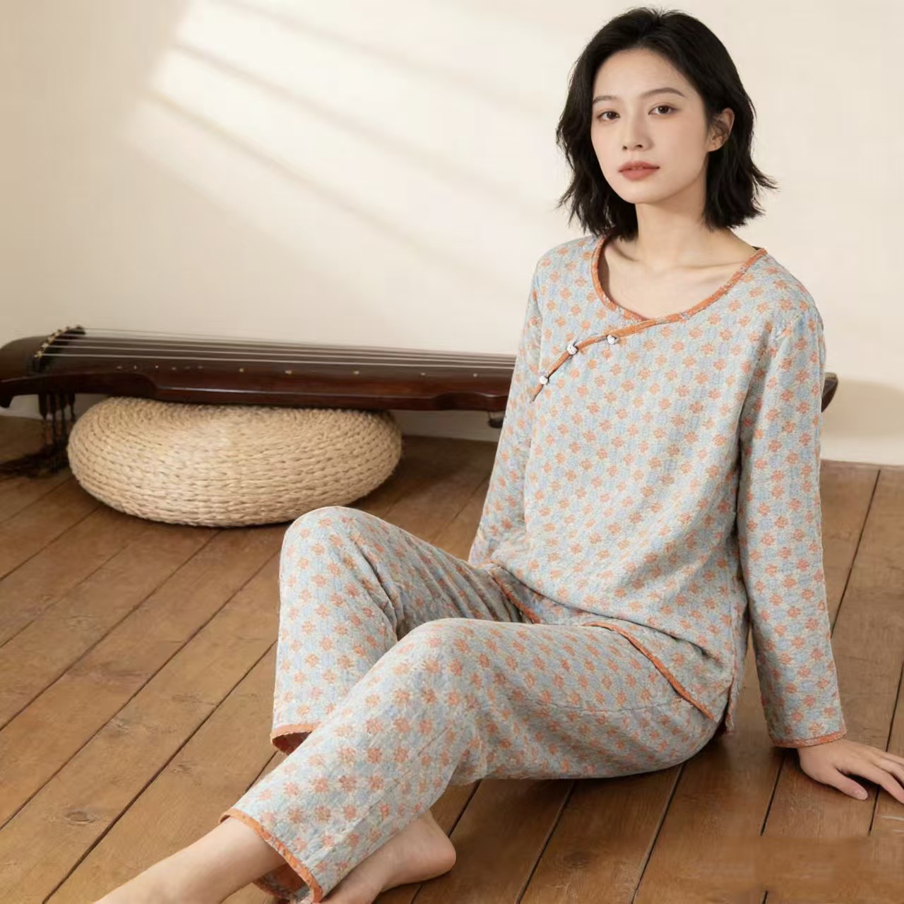 国风色织提花偏襟珠扣睡衣套装女士四季薄款长袖长裤可外穿家居服