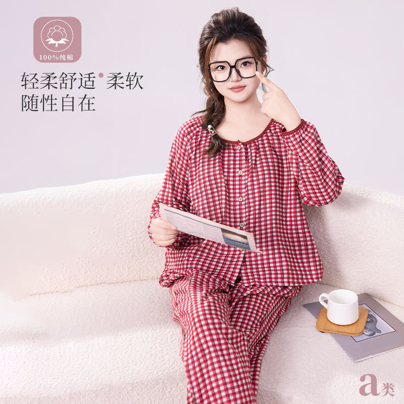 新款纯棉纱布睡衣 春秋女长袖长裤a类纯棉圆领家居服套装批发厂家