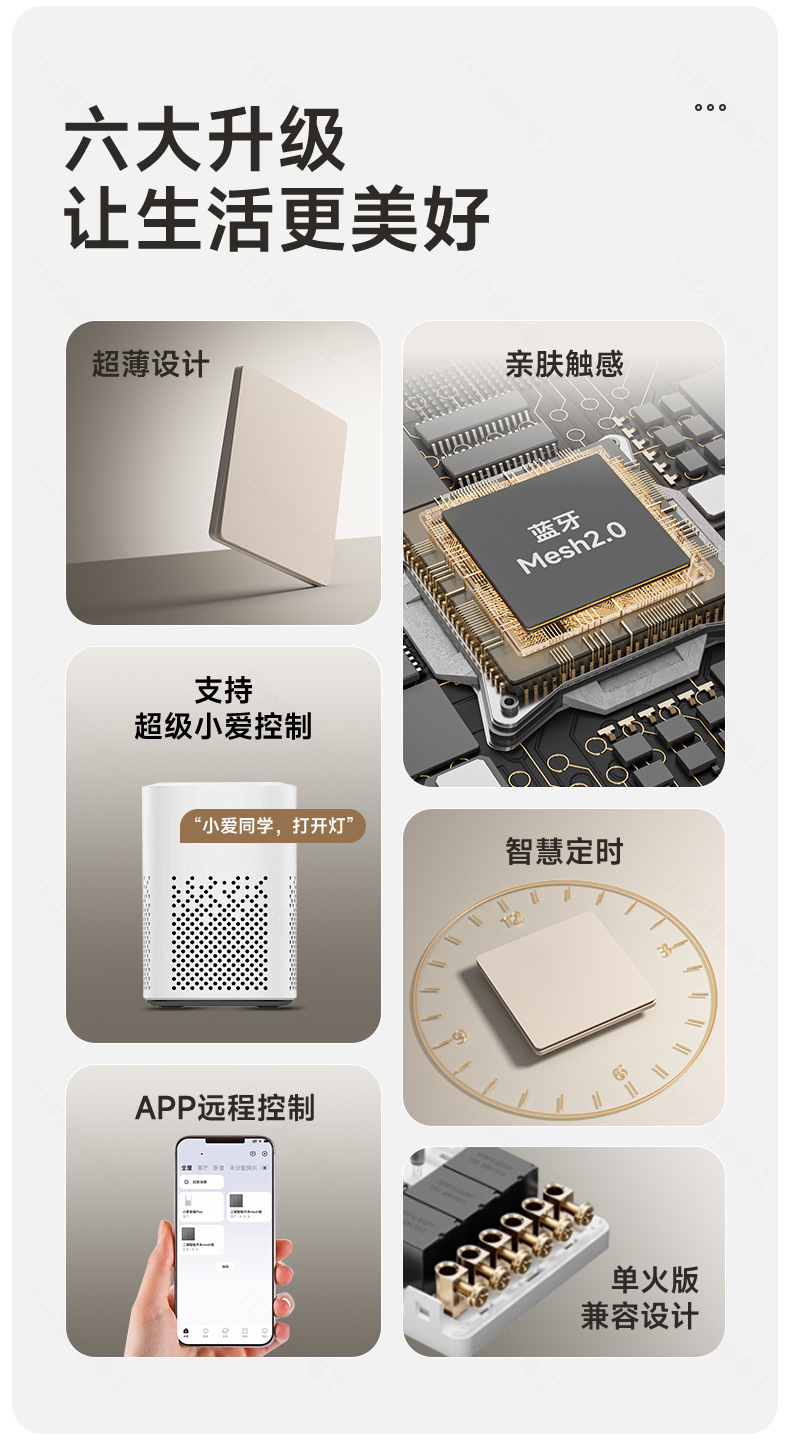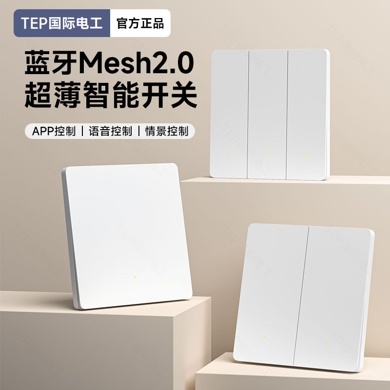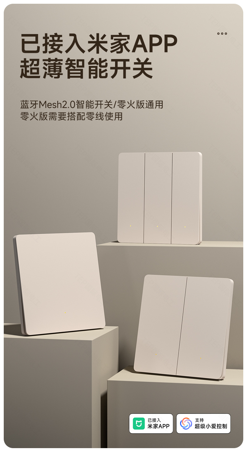 Mijiaアプリに接続された超薄型スマートスイッチパネルはBluetooth mesh2.0を搭載しており、Xiaoai音声コントロールをサポートしています。