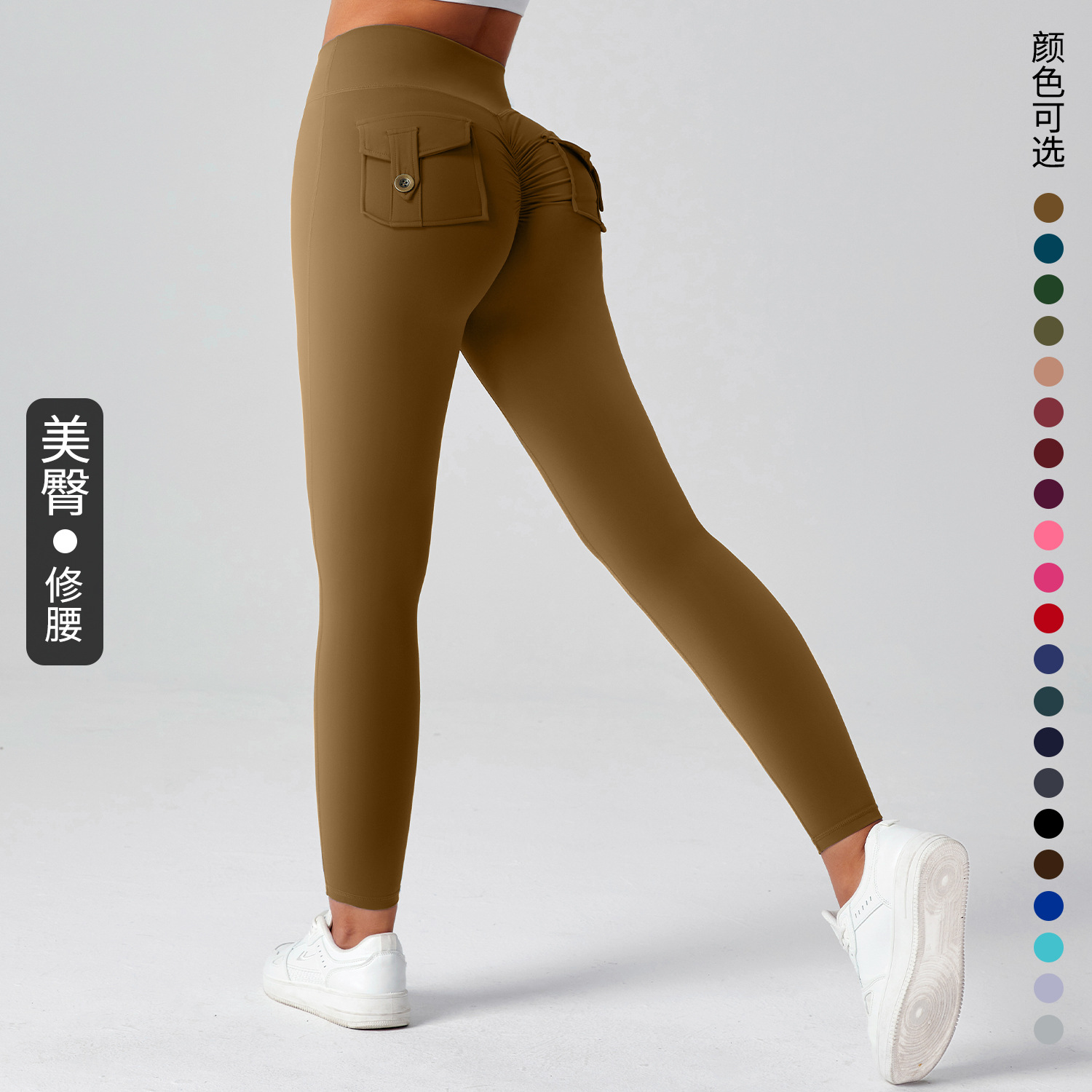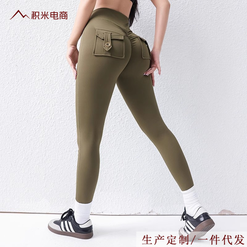 工装提尻ヨガパンツ高腰ポケット運動フィットネスパンツ女性裸感高弾ランニング速乾運動タイツ