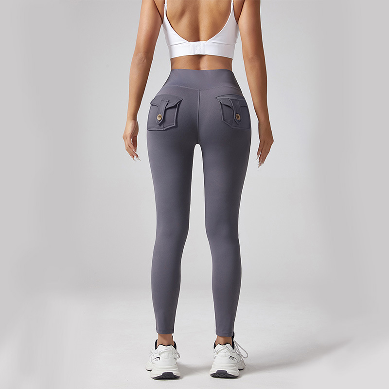 裸感工装紧身纽扣高腰提臀瑜伽裤女口袋运动紧身裤蜜桃健身裤