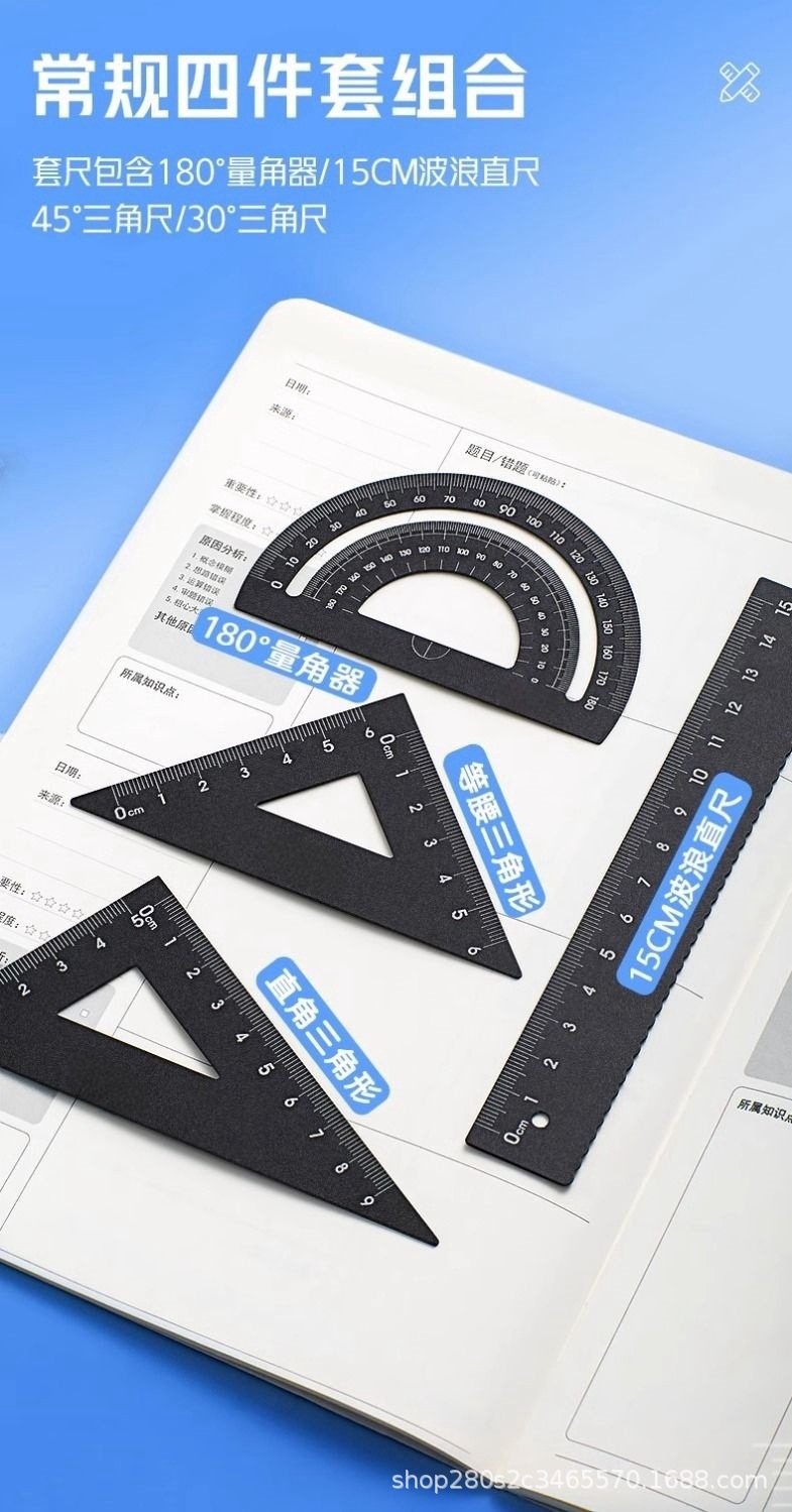 金属套尺15CM波浪尺学生量角器三角板考试测量用品学生四件套套尺