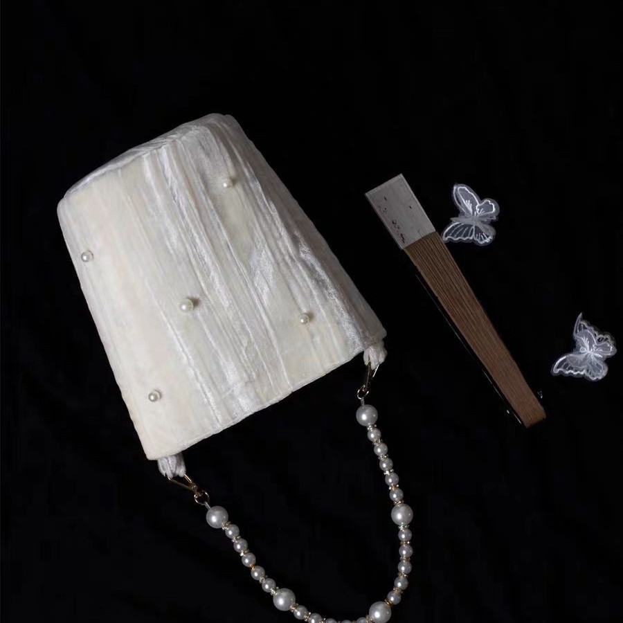 原创小众设计珍珠肌理丝绒水桶包奶油白色名媛淑女搭配单肩斜挎包