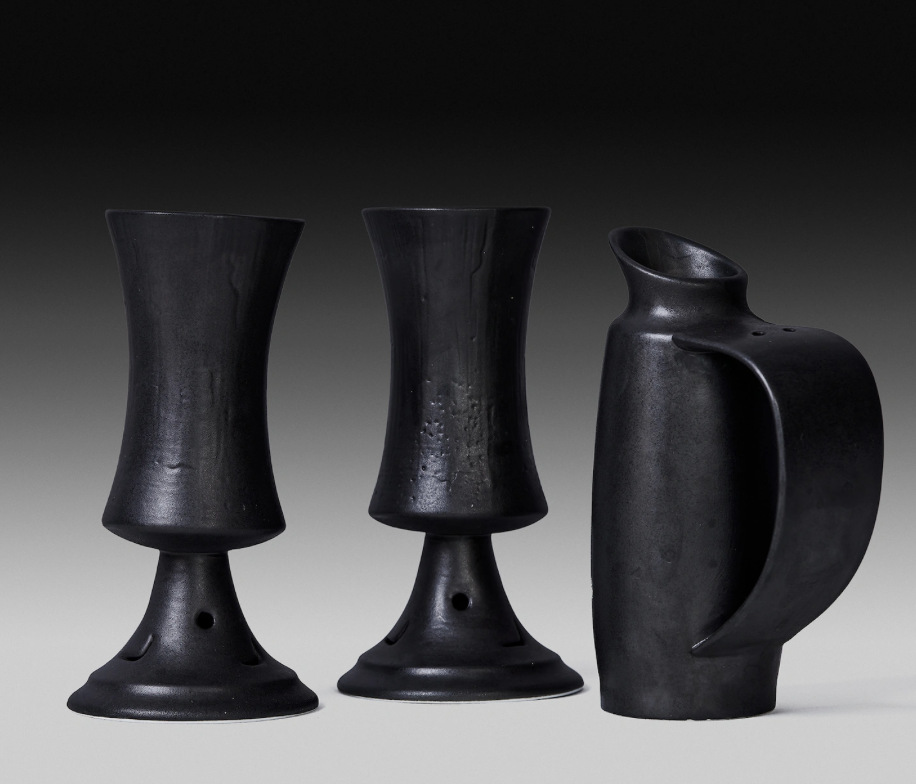 宽把杯,酒器。为了便于倒酒,把口沿做成了流口状,宽把的造型也非常独特,上面装饰有两个小孔,用于穿绳显得精致美观。