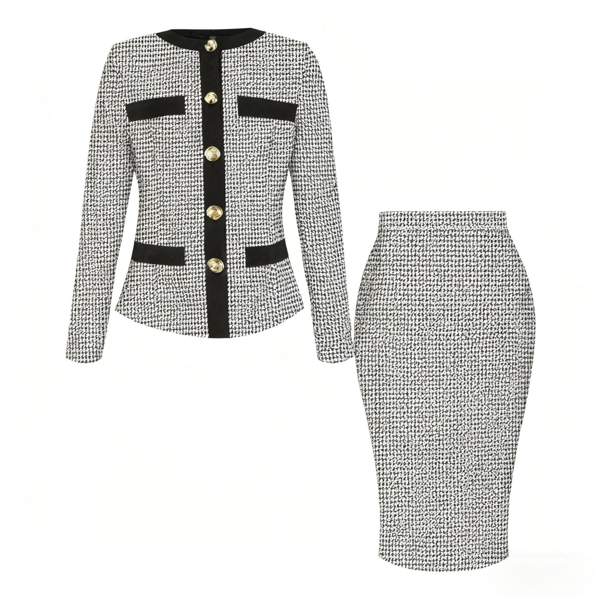 2025欧美跨境女装小香风修身针织千鸟格排扣长袖两件套时尚套装