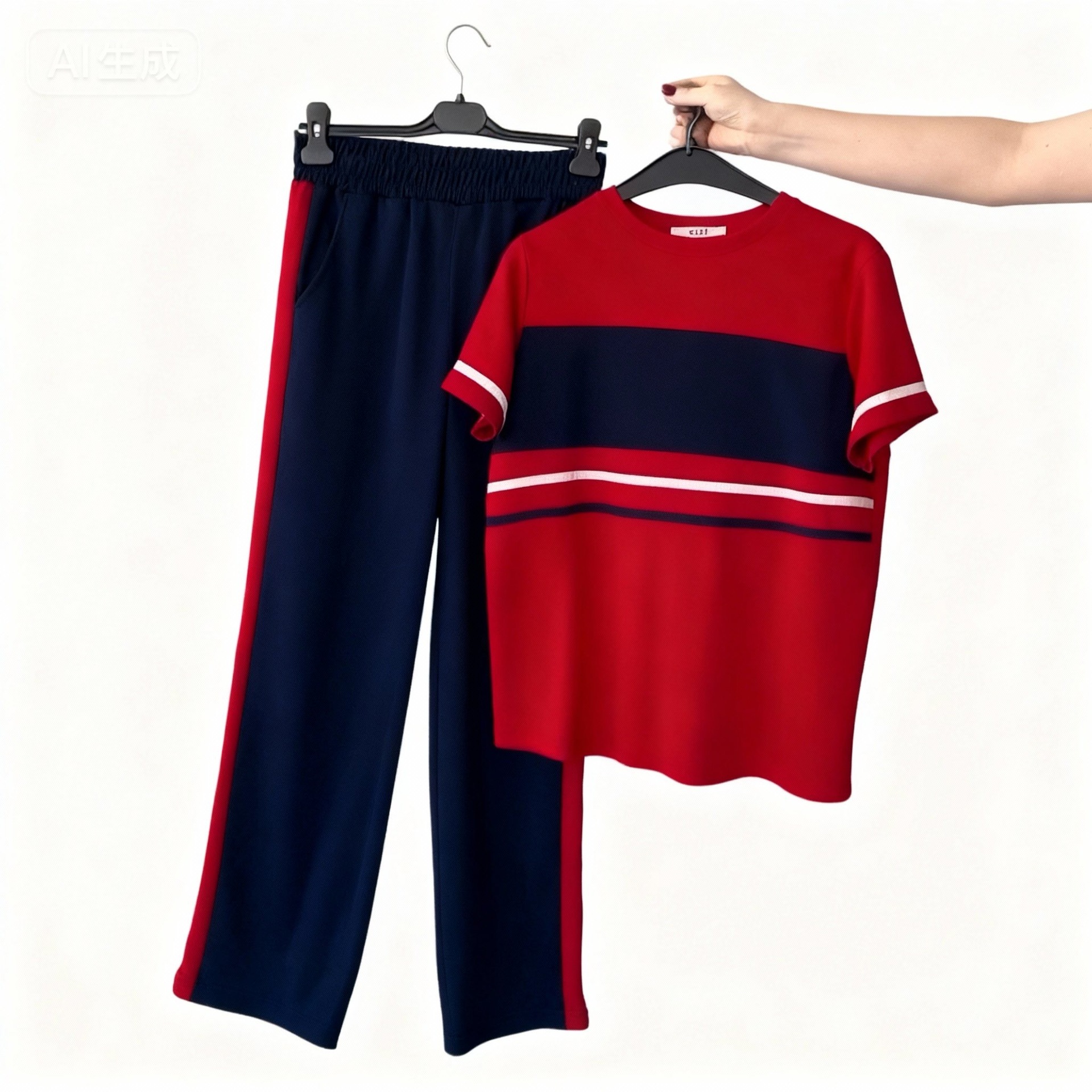 26春季新款卫衣两件套撞色拼色套装非洲外贸批发爆款长裤短袖女装