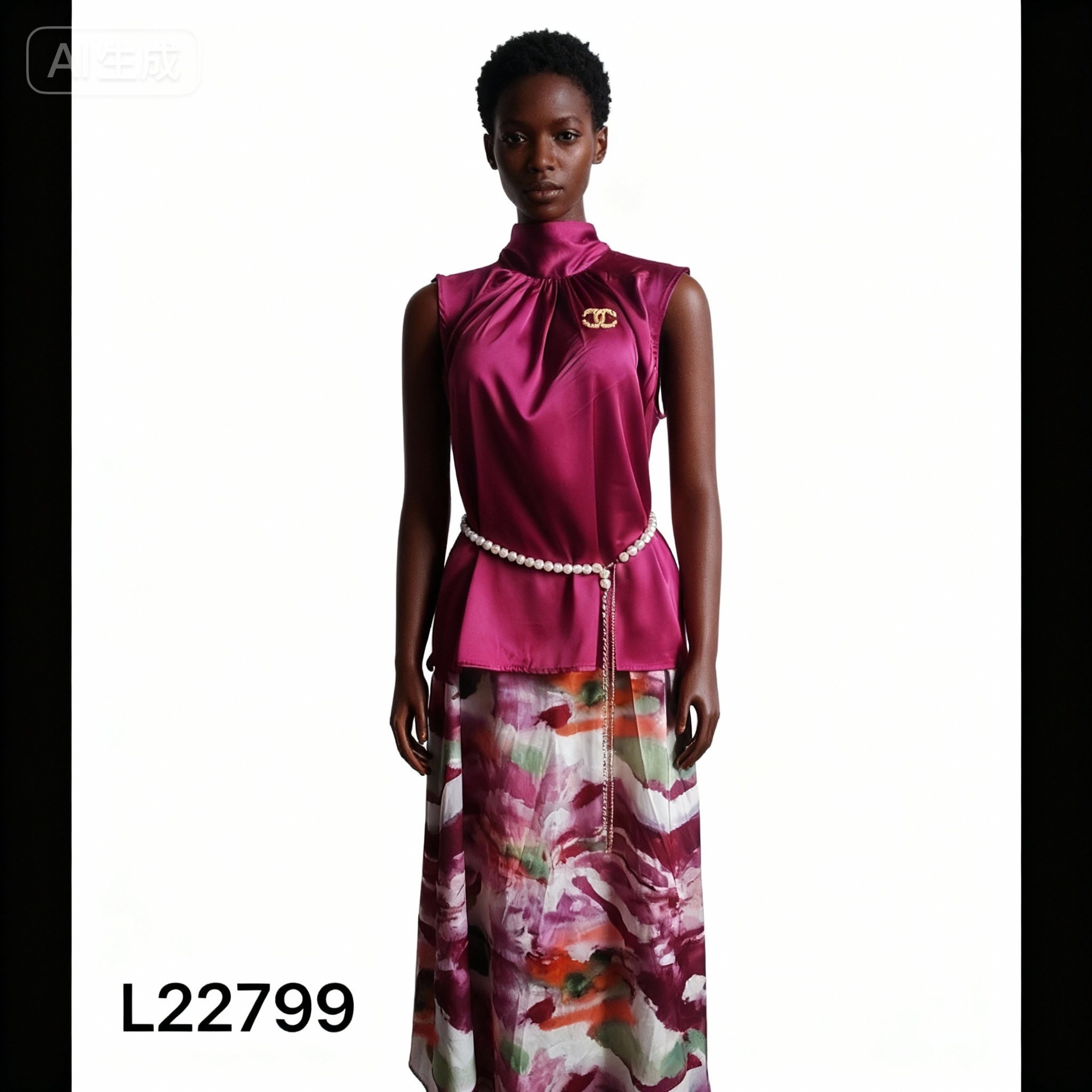 送珍珠腰带外贸批发大码女装半身裙套装撞色印花背心系带女装拼色