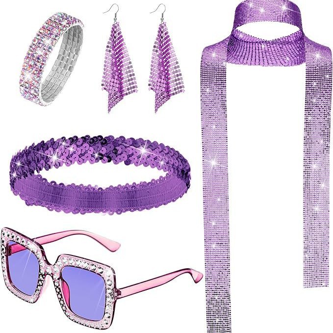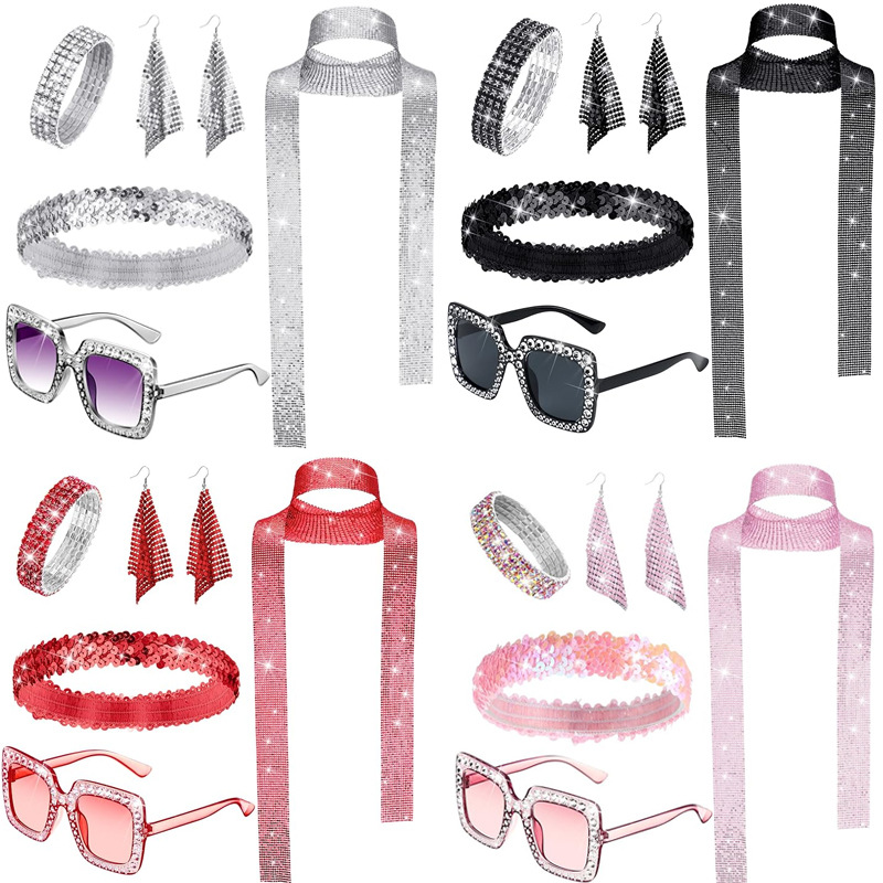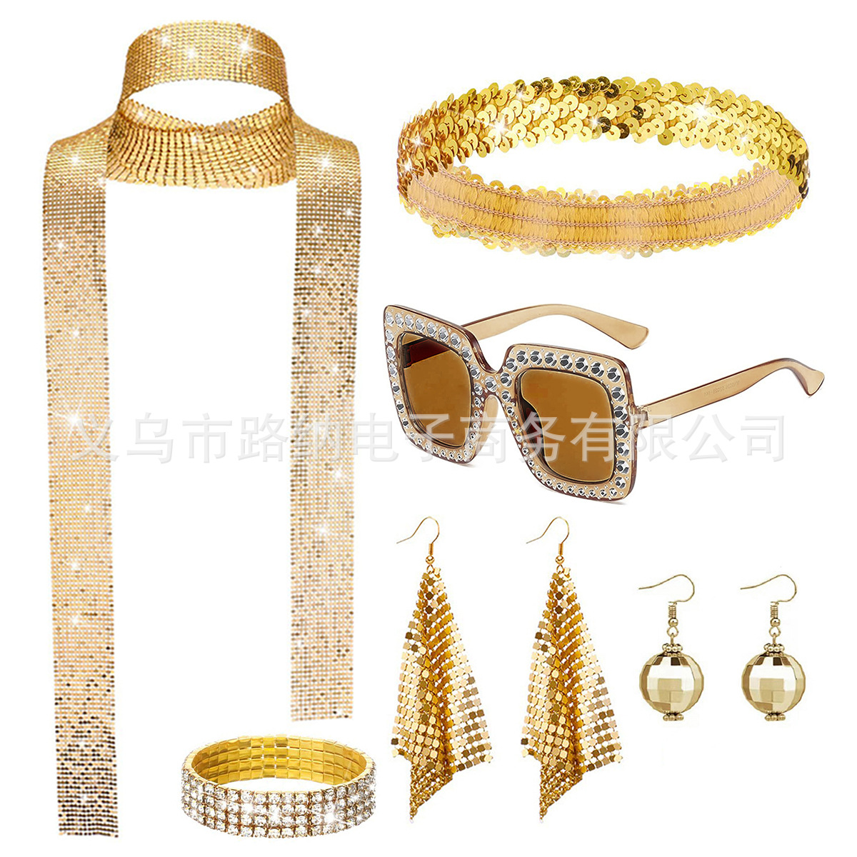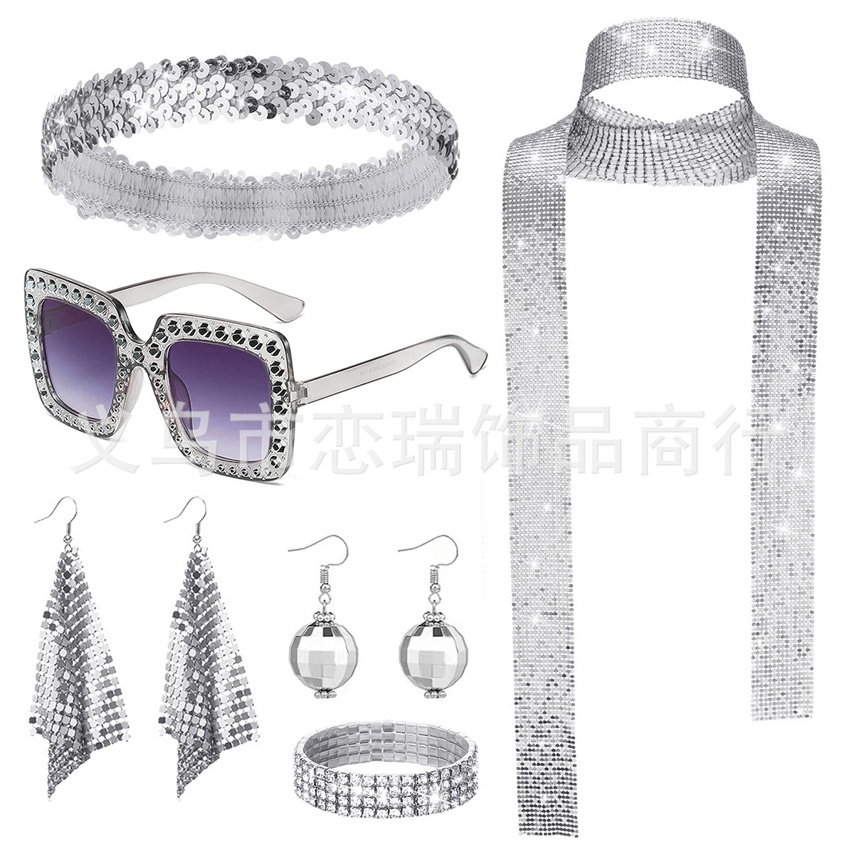 1970迪斯科亮片耳环围巾头带镶钻眼镜手镯球形耳环套装舞会派对
