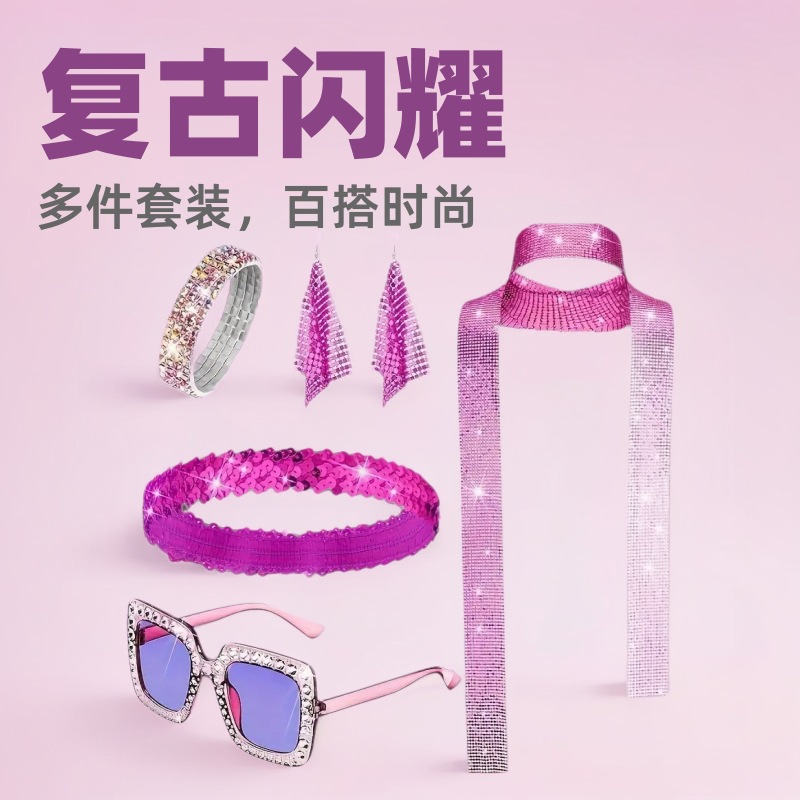 70年代disco服装派对项链配饰亮片头带太阳镜围巾耳环手链套装