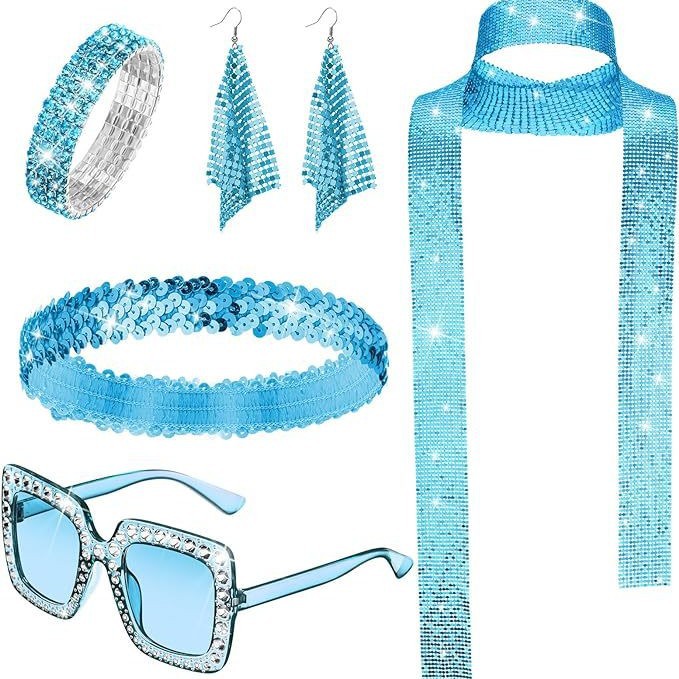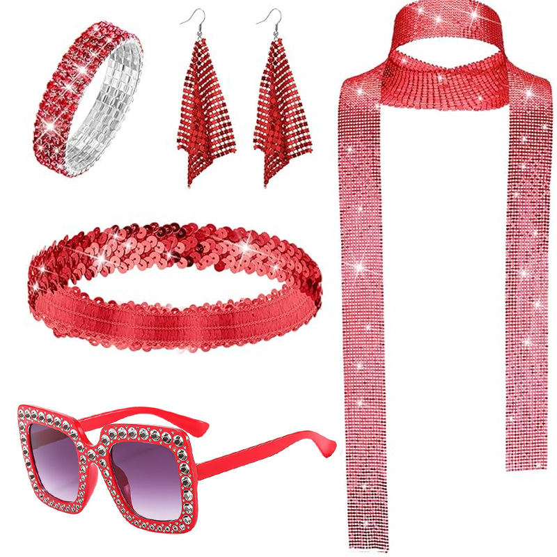 70年代ディスコ五点セットレディースジュエリーイヤリングスパンコールスカーフサングラスブレスレットヘッドバンドアクセサリーセット