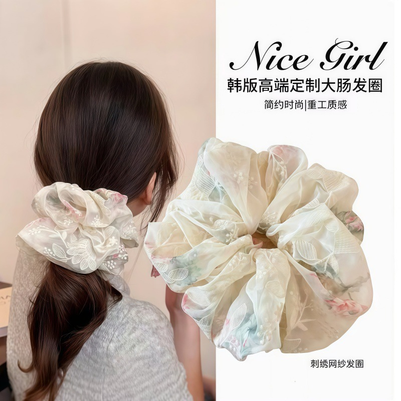 夏の超仙の甘い刺繍の網の糸の大腸のシュシュの大きいサイズの高級感の花のひもの少女の皮の筋の髪の縄の女性