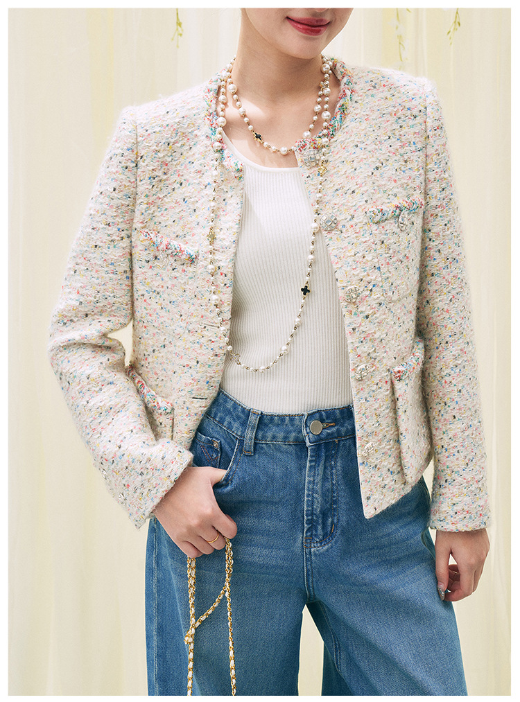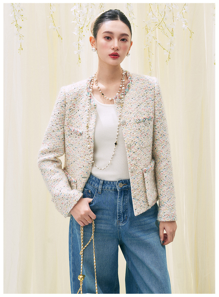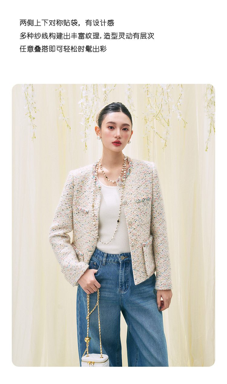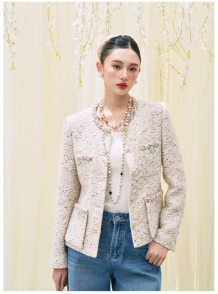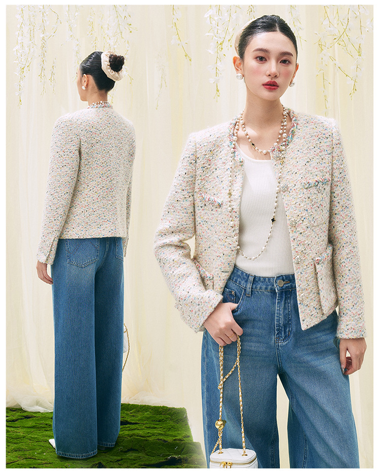 【盛都】26春新作 フレンチスタイル 高級感あふれるシャネル風 光沢のある織り込みツイード ショート丈ウールジャケット