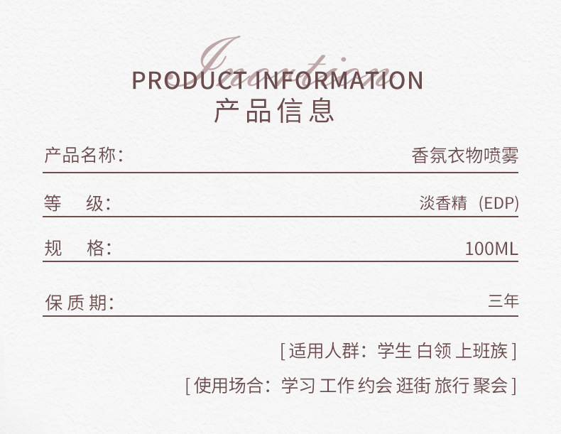 衣物香氛护衣除臭喷雾持久留香衣物免洗防静电消毒抑菌除螨柔顺剂
