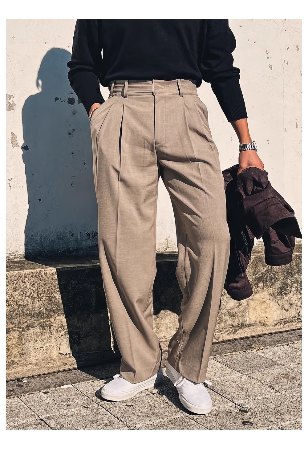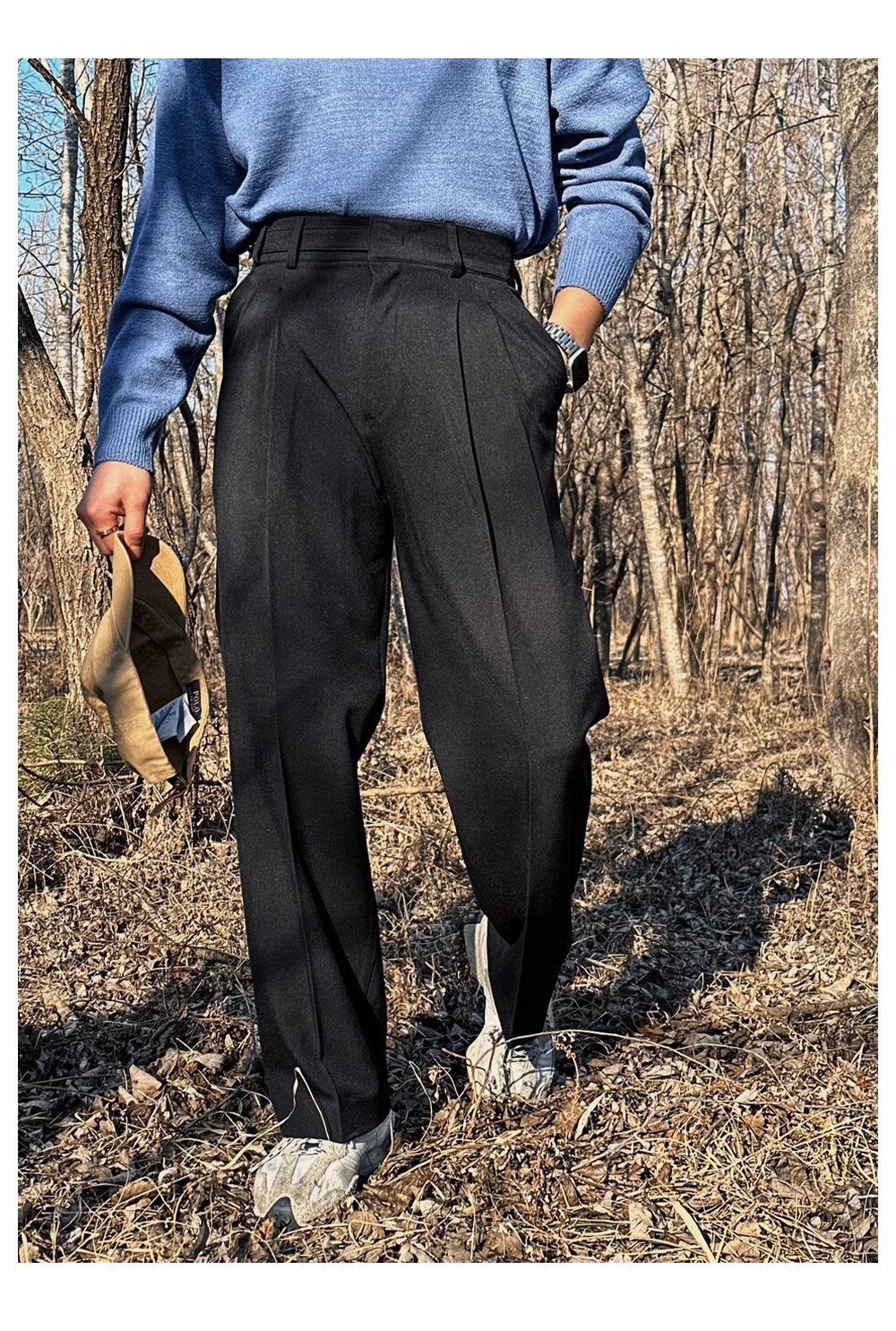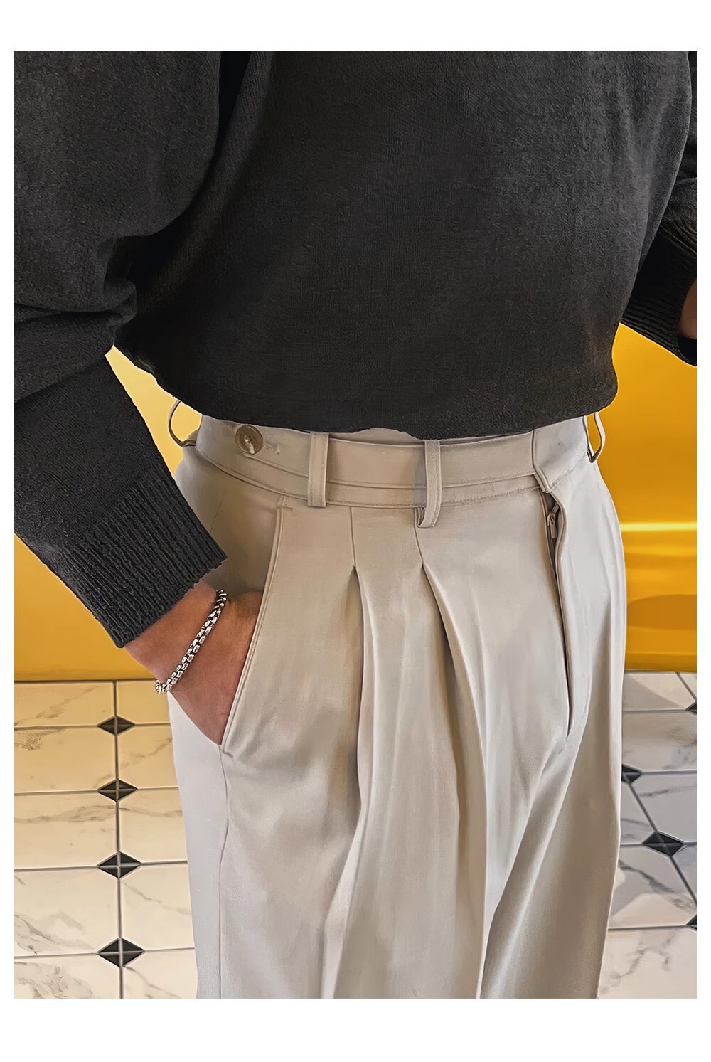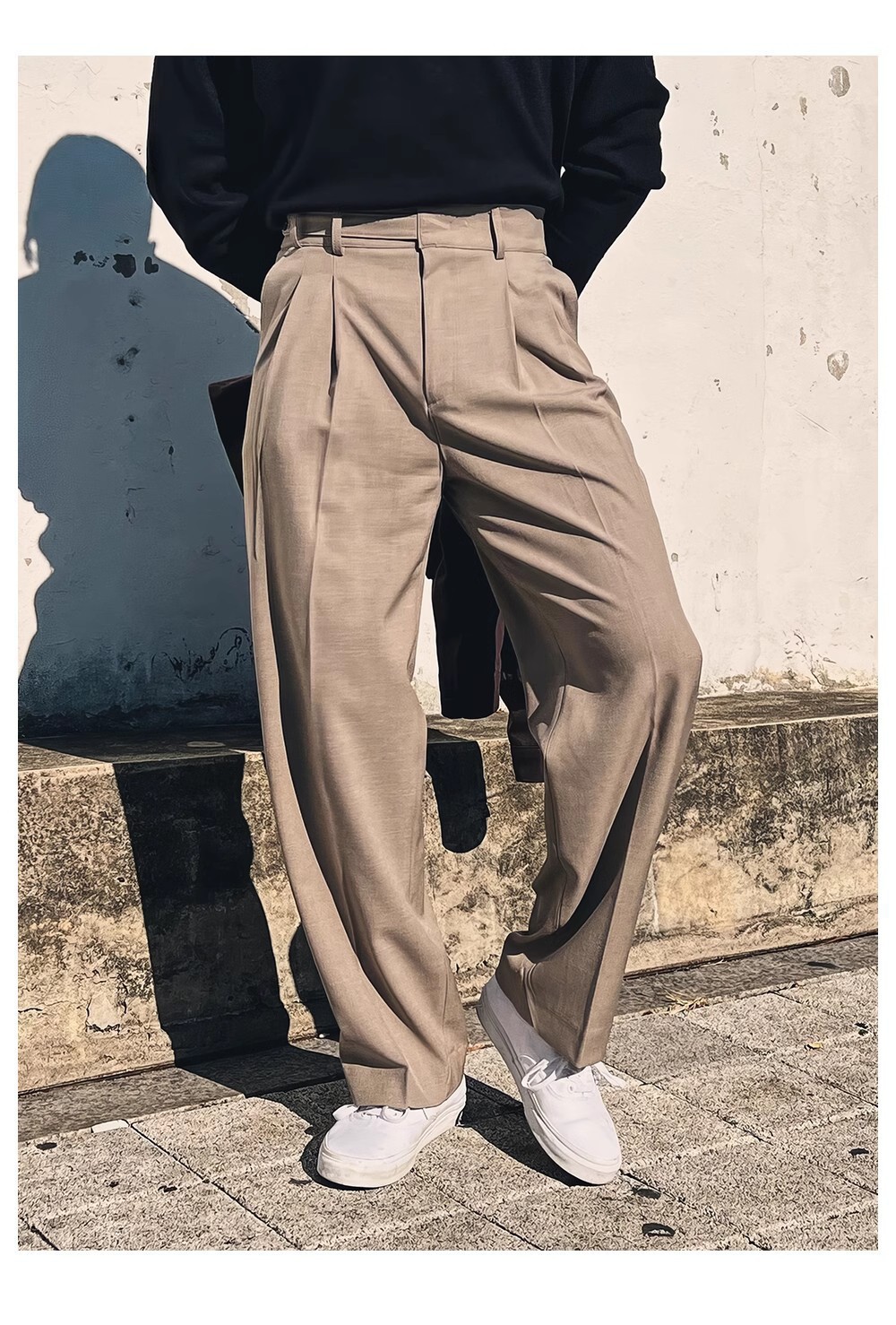 ダブルプリーツ調節可能なボタンパンツ カーキ,ダブルプリーツ調節可能なボタンパンツ ブラック