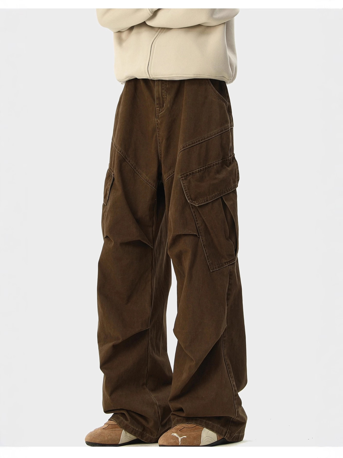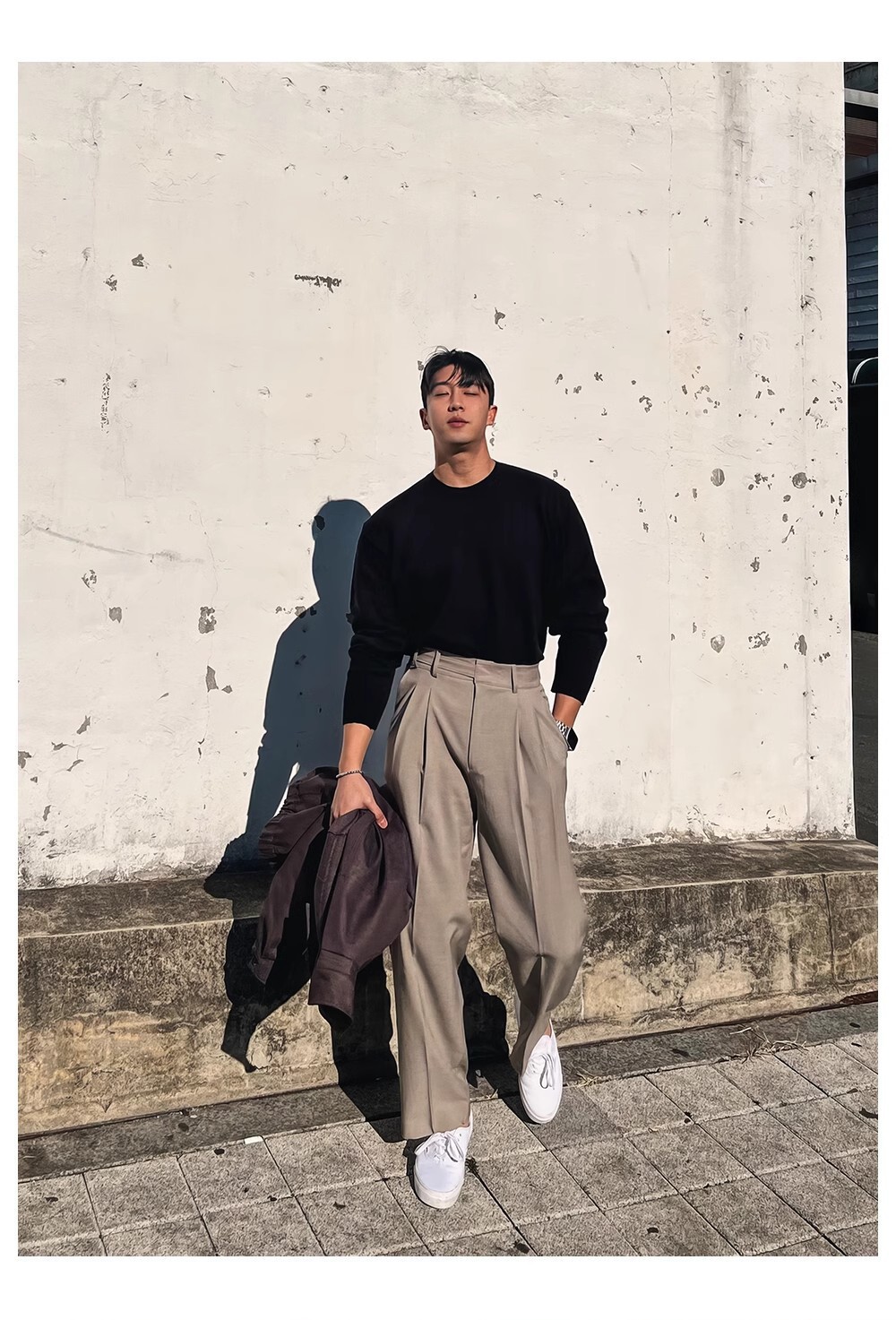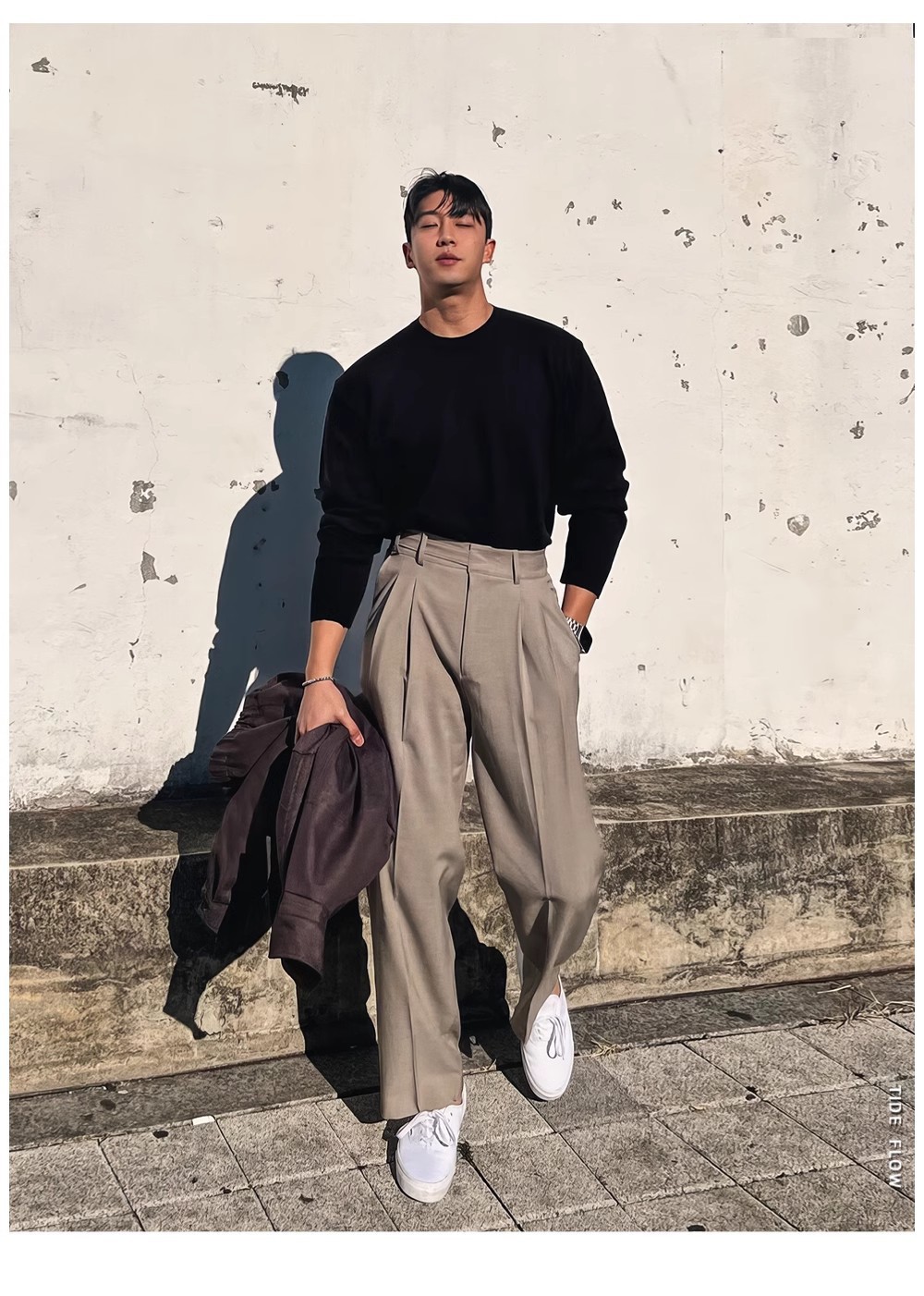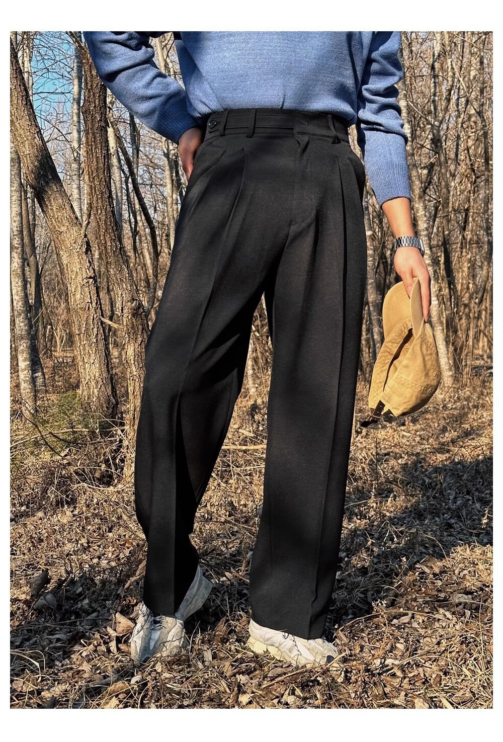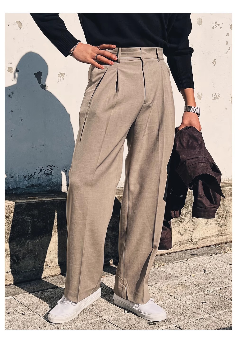 ダブルプリーツ調節可能なボタンパンツ カーキ,ダブルプリーツ調節可能なボタンパンツ ブラック