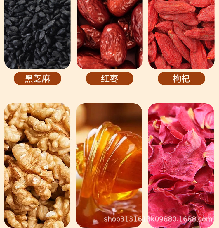 原材料と原材料 黒ごま、クコ、ナツメヤシ、クルミなど