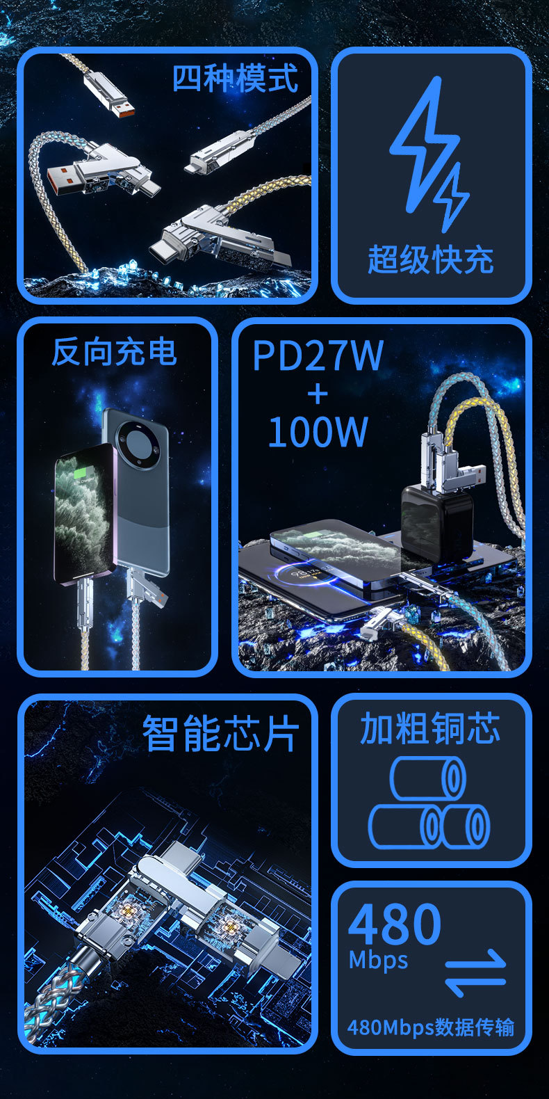【跨境热销】发光满天星四合一数据线手机超级快充电线二拖二车载