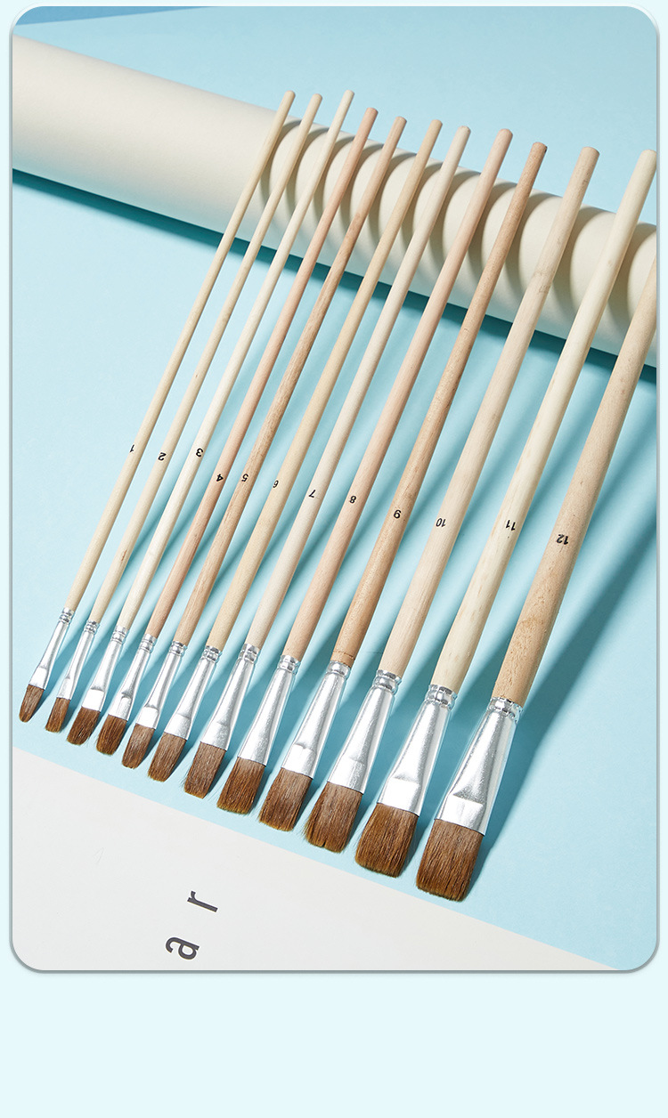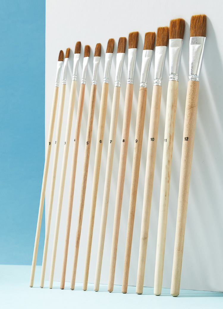 クロスボーダー卸売12本豚毛木製柄絵筆、アート用平頭丸頭絵筆、学生用絵画、ガッシュ油絵