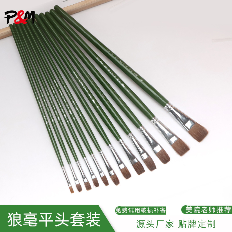 工場卸売 狼毛平筆 水彩筆 油絵筆セット 12本入り 緑色木柄 絵筆 ブラシ