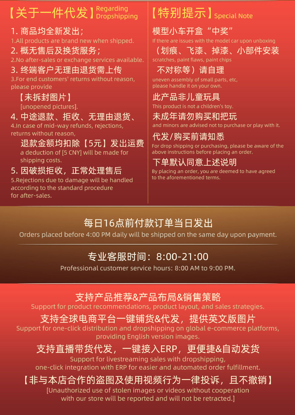 1688.comは中国で生産され、流通している商品を扱うBtoB卸サイトとなります。お客様が弊社サイト内にて仕入処理をされても、日本国内の法律に則り、日本への輸入ができない商材もあり、その場合弊社でも仕入れの手配が出来ません。その際はシステム上で、自動的に注文削除となってしまう事を、恐れ入りますがご了承願います。