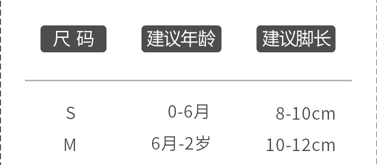 子供用靴下のサイズ Sサイズ 0-6ヶ月 推奨足長8-10CM,Mサイズ 6ヶ月~2歳 推奨足長10~12CM