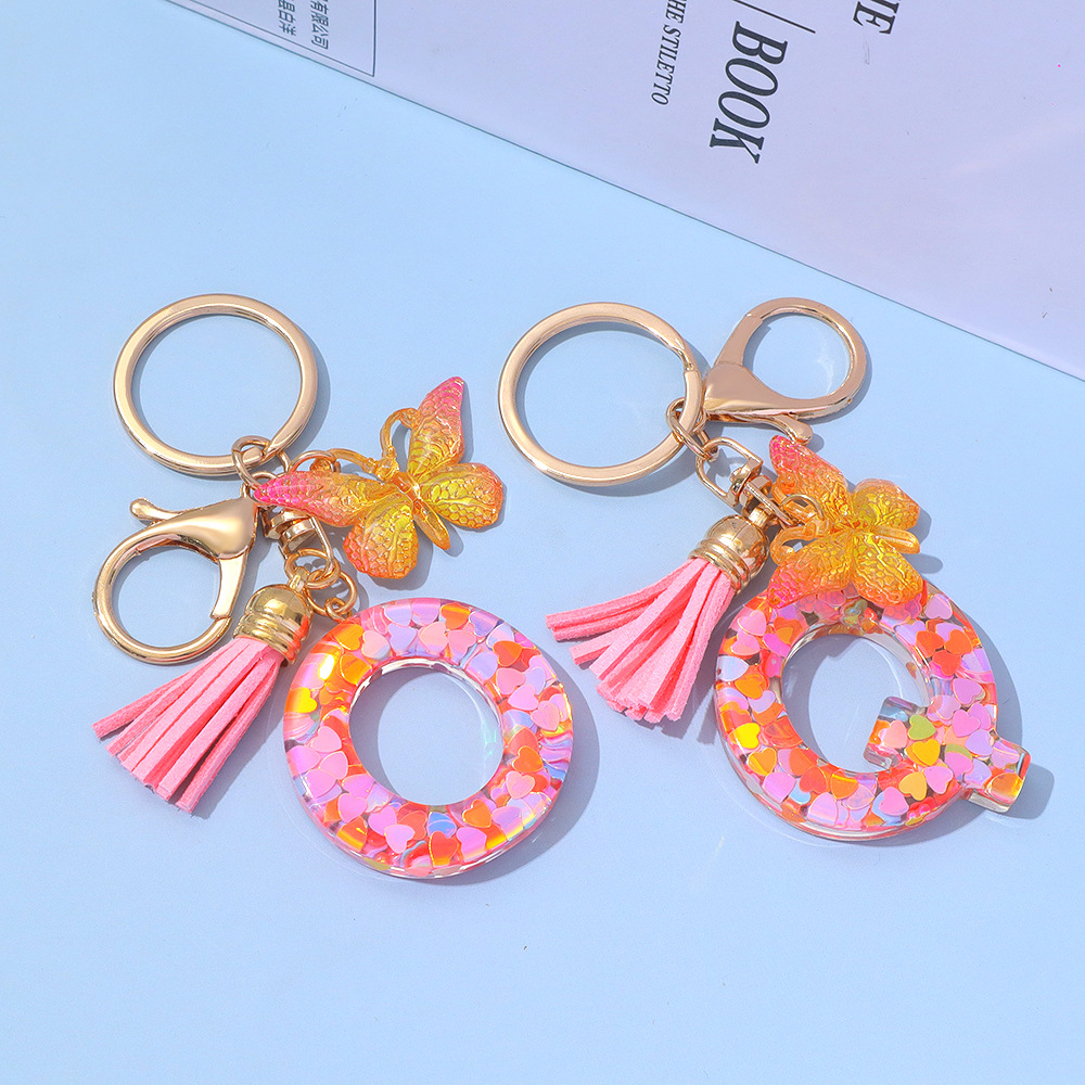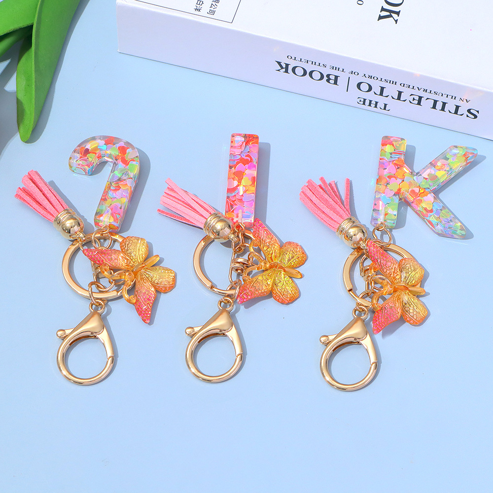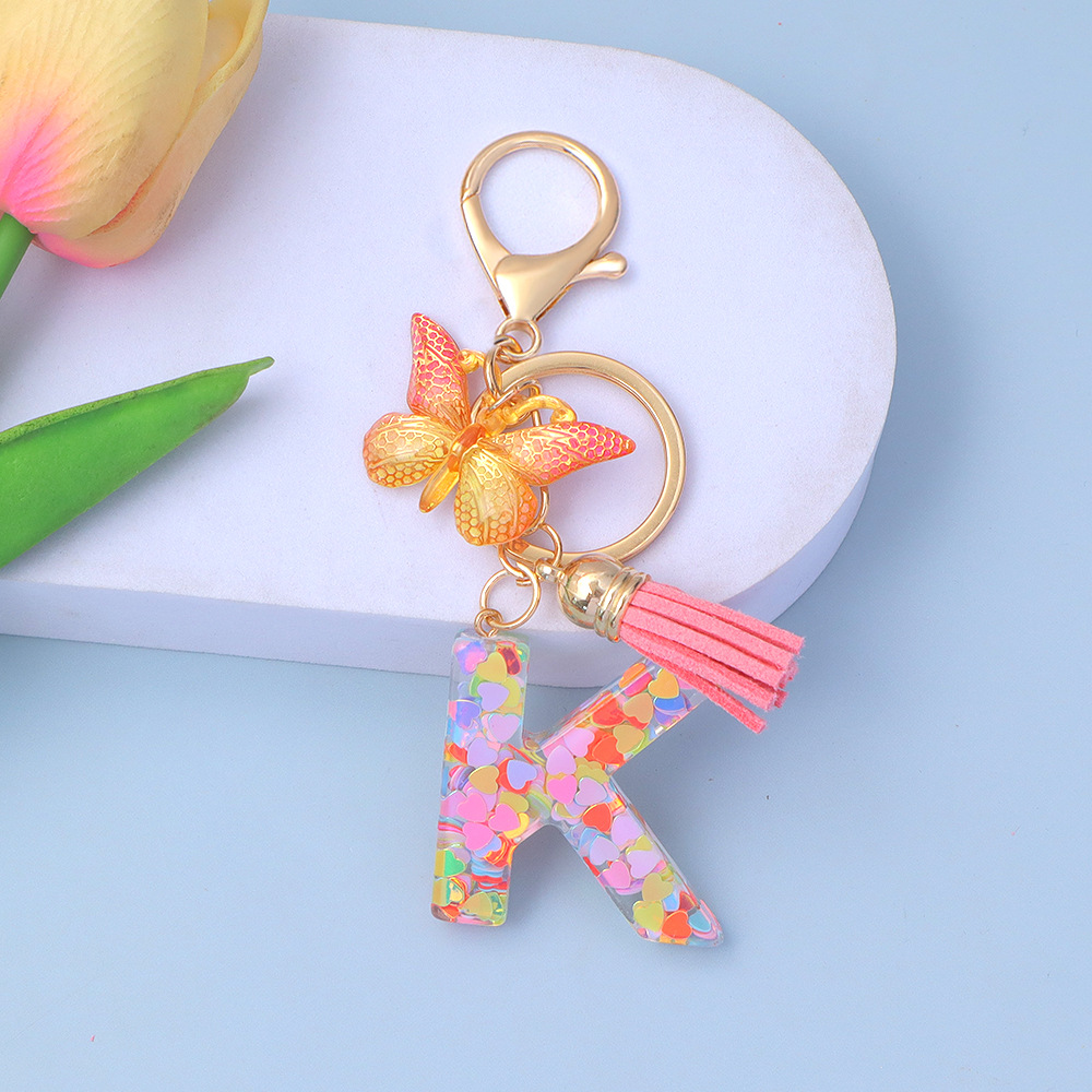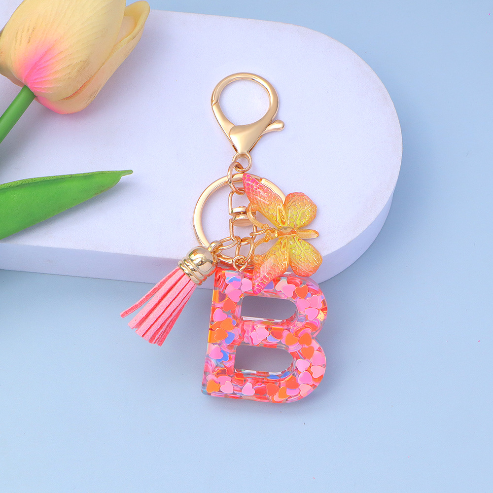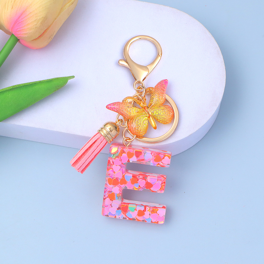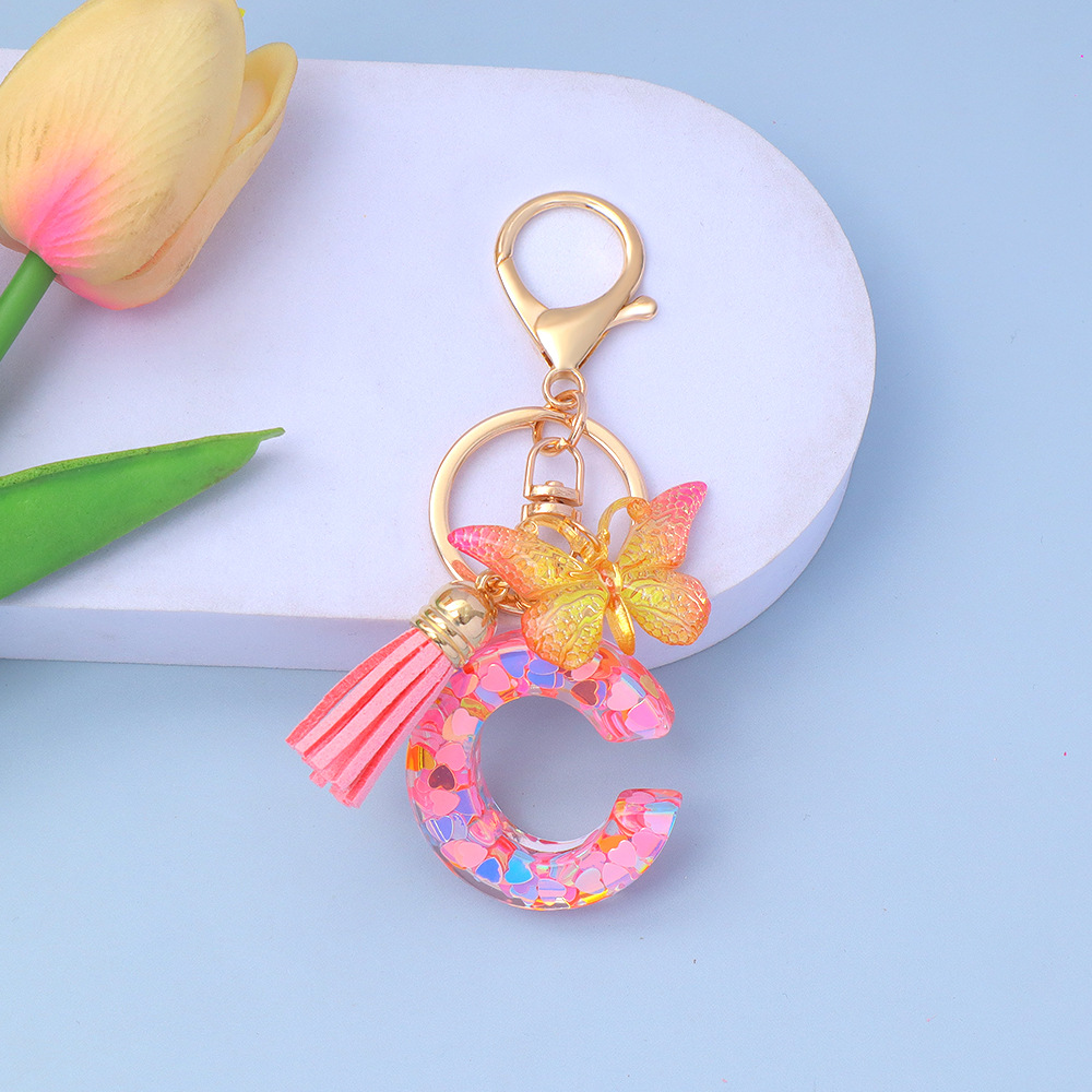ピンクのスパンコールのアルファベットのキーは蝶のフリンジのペンダントを掛けます。