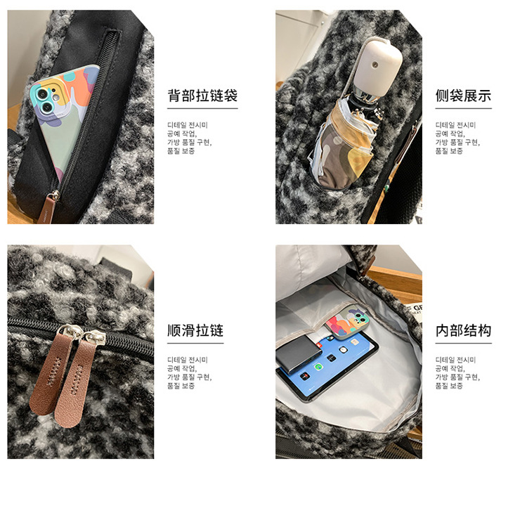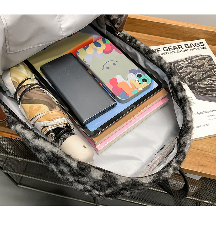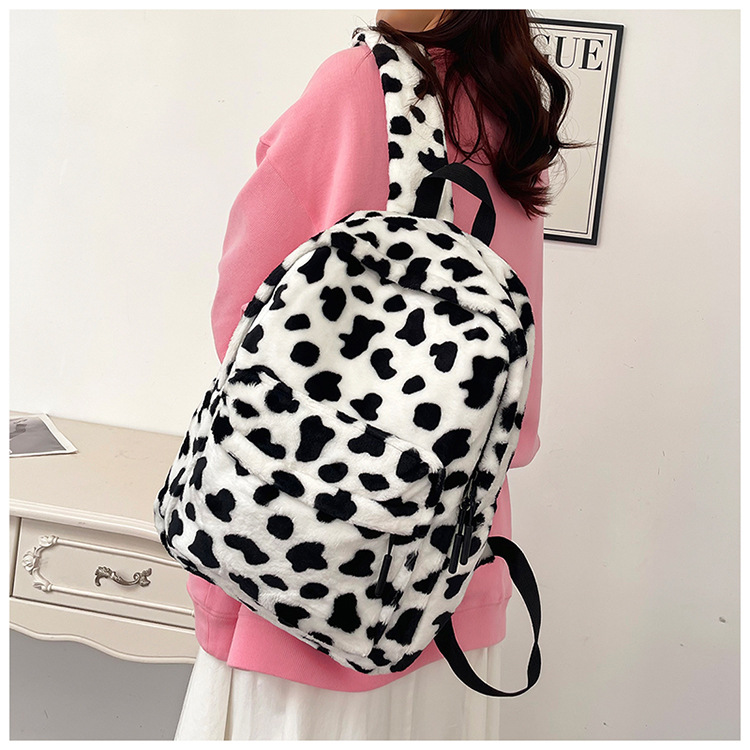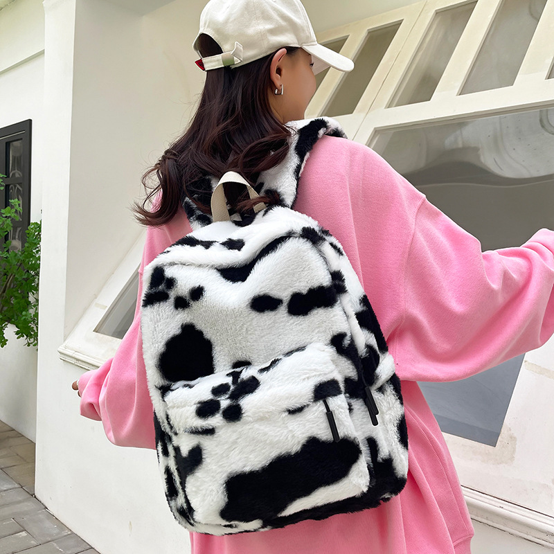 秋冬爆款毛绒学生书包可爱少女奶牛纹毛绒双肩包大容量通勤背包