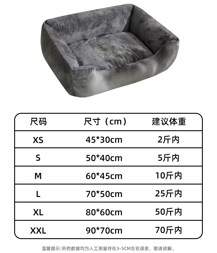 颜色 S-50*40【适用5斤内|建议拍大一码】,XXL-90*70【超大空间|多只爱宠共睡】,M-60*45【推荐10斤内宠物】,L-70*50【推荐25斤内|大多数人的选择】,XL-80*60【推荐50斤内|大型犬适用】