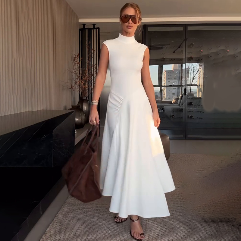 2025秋ヨーロッパとアメリカのアマゾンクロスボーダー外国貿易新しい無地ファッションノースリーブハイカラープリーツカジュアルドレス