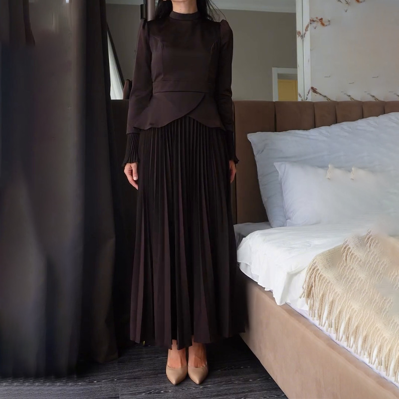 欧米のアマゾンは国境を越えて外国貿易の新型ファッション通勤気質丸首純色の長袖のシワのスカートのスーツを越えます。