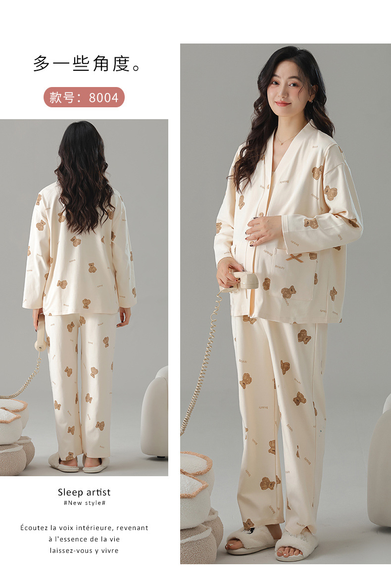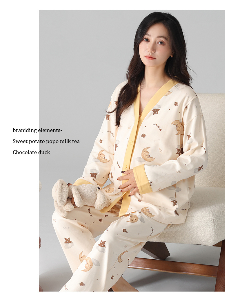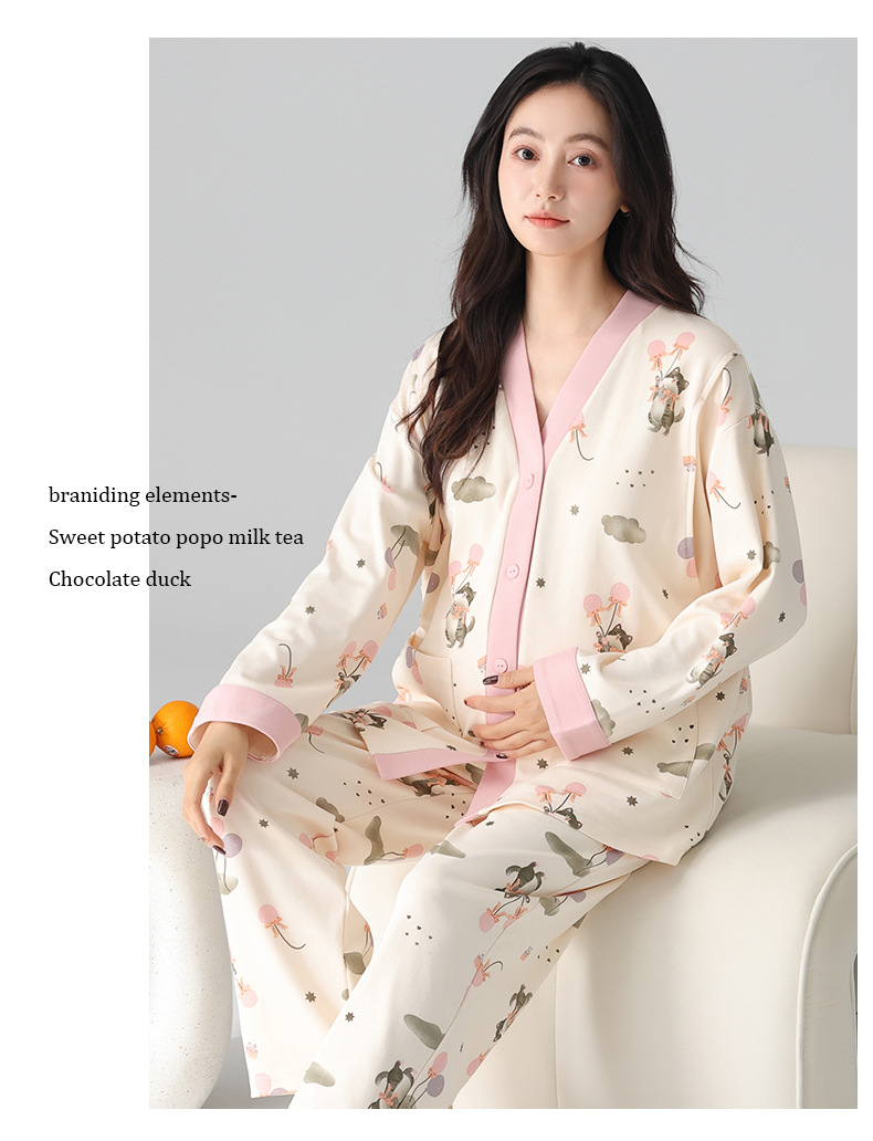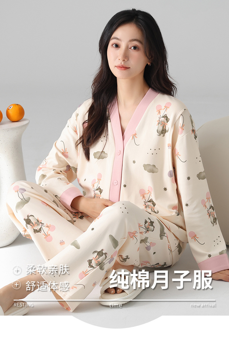 純綿春夏パジャマ女性妊婦ズボンウエストゴム付き月子服授乳口胸パッド付きカーディガン家庭服セット