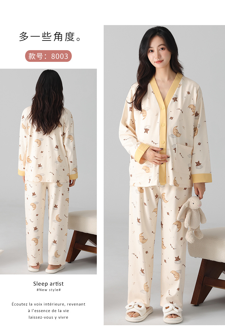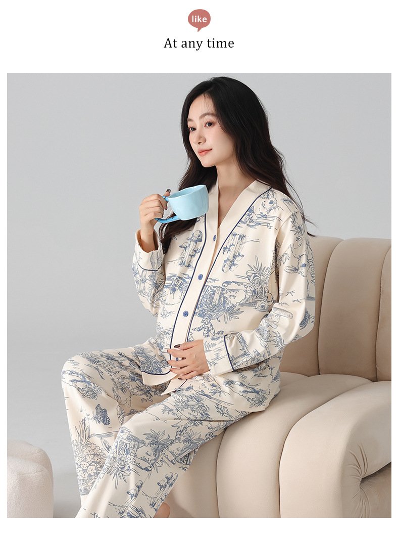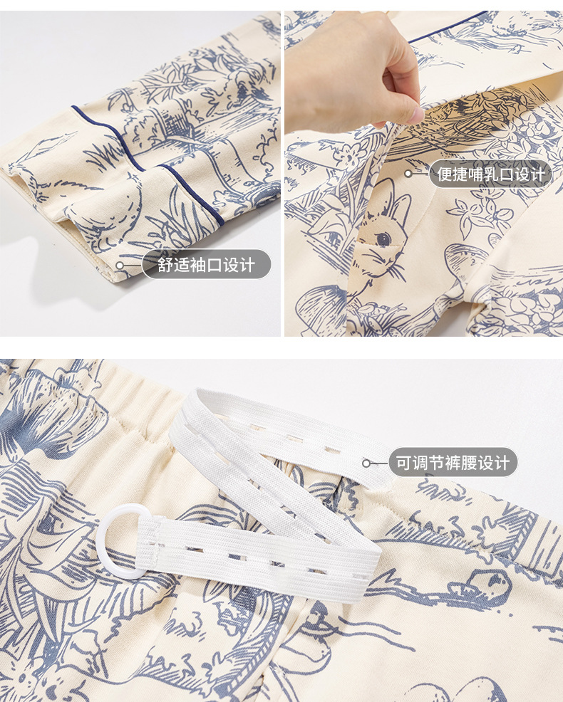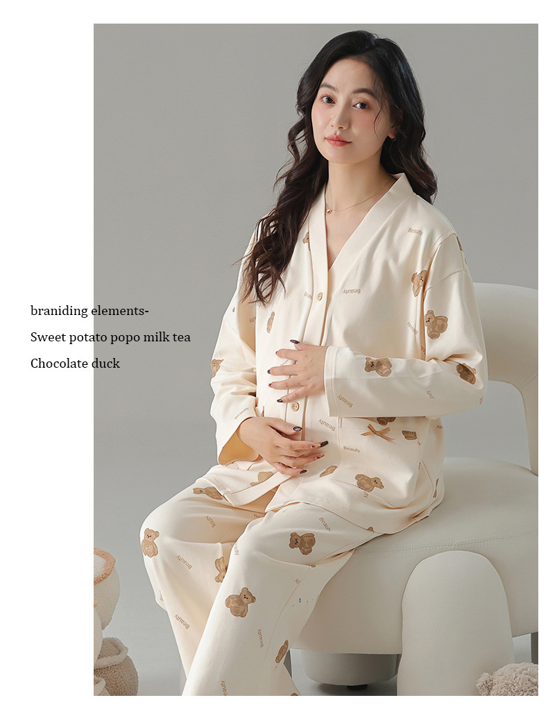 純綿春夏パジャマ女性妊婦ズボンウエストゴム付き月子服授乳口胸パッド付きカーディガン家庭服セット