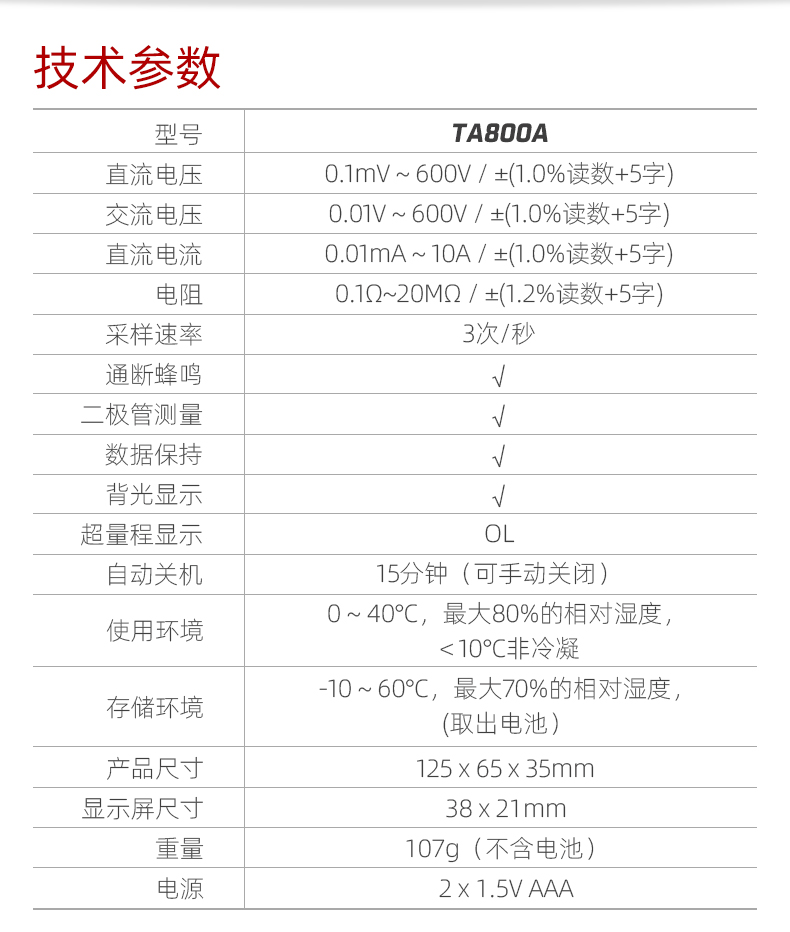 モデル ♣♨♨♨♨♣ TA806A [自動識別] (AC/DC 600V + 抵抗 + オン/オフ + NCV)♣♨♨♨♨♣,♣♨♨♨♨♣ TA800A [マニュアルトランスミッション] (AC/DC電圧600V + DC電流10A + ダイオード)♣♨♨♨♨♣,♣♨♨♨♨♣ TA801D [自動識別] (AC/DC 600V/600mA + コンデンサ + ダイオード + NCV + 懐中電灯)♣♨,♣♨♨♨♨♣ TA802B [ペン型マルチメーター](自動識別)+布送り袋♣♨♨♨♨♣,♣♨♨♨♨♣ TA804A [大画面] (全自動識別)♣♨♨♨♨♣,♣♨♨♨♨♣ TA804B [カラースクリーン] (全自動識別/マニュアル+コンデンサ+ダイオード)♣♨♨♨♨♣,♣♨♨♨♨♣ TA8306A [大画面] (全自動/手動 + 600mA 電流 + コンデンサ + ダイオード)♣♨♨♨♨♣,♣ ♨ ♨ ♨ ♨ ♣ TA80 [カラースクリーン] (全自動/手動 + 10A 電流 + コンデンサ + ダイオード + 温度) ♣ ♨ ♨ ♨ ♨ ♣,♣♨♨♨♨♣ TA805B [ワイヤレス充電] (全自動/手動 + 10A 電流 + コンデンサ + ダイオード + 温度)♣♨♨♨♨♣