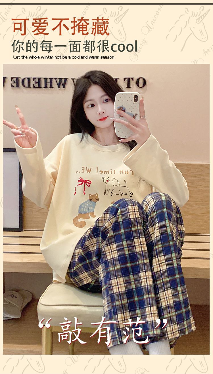 春秋季带胸垫睡衣女新款网红风仿棉长袖长裤束脚口圆领家居服套装