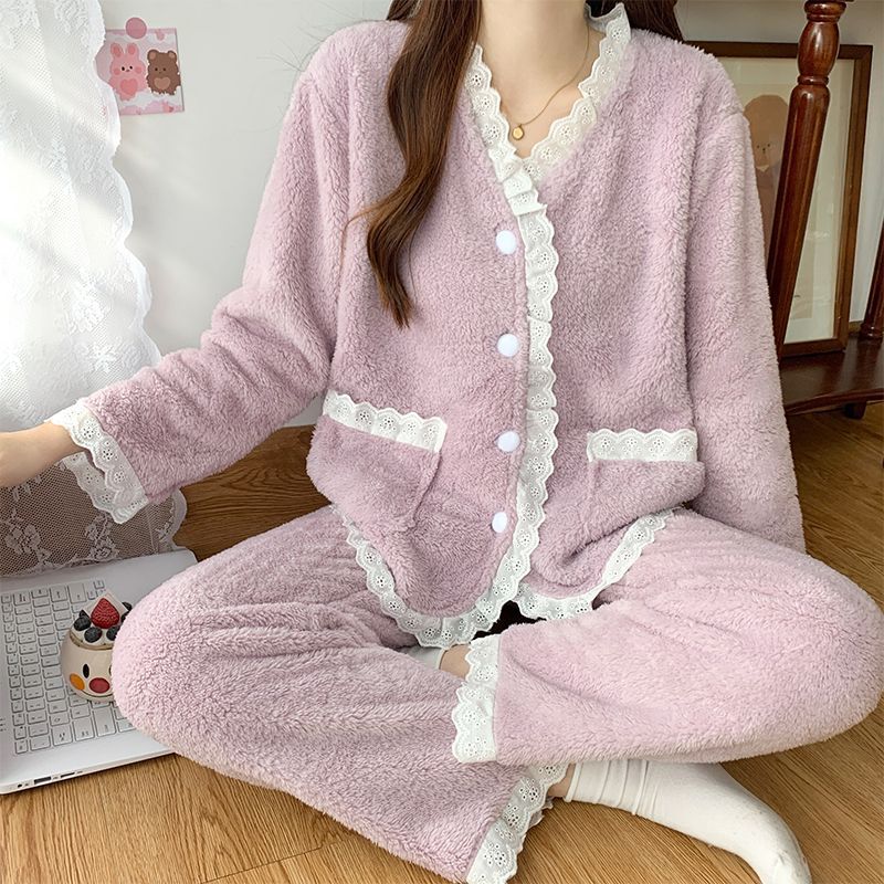 珊瑚绒睡衣女秋冬款韩版小香风花边长袖套装加厚保暖家居服可外穿