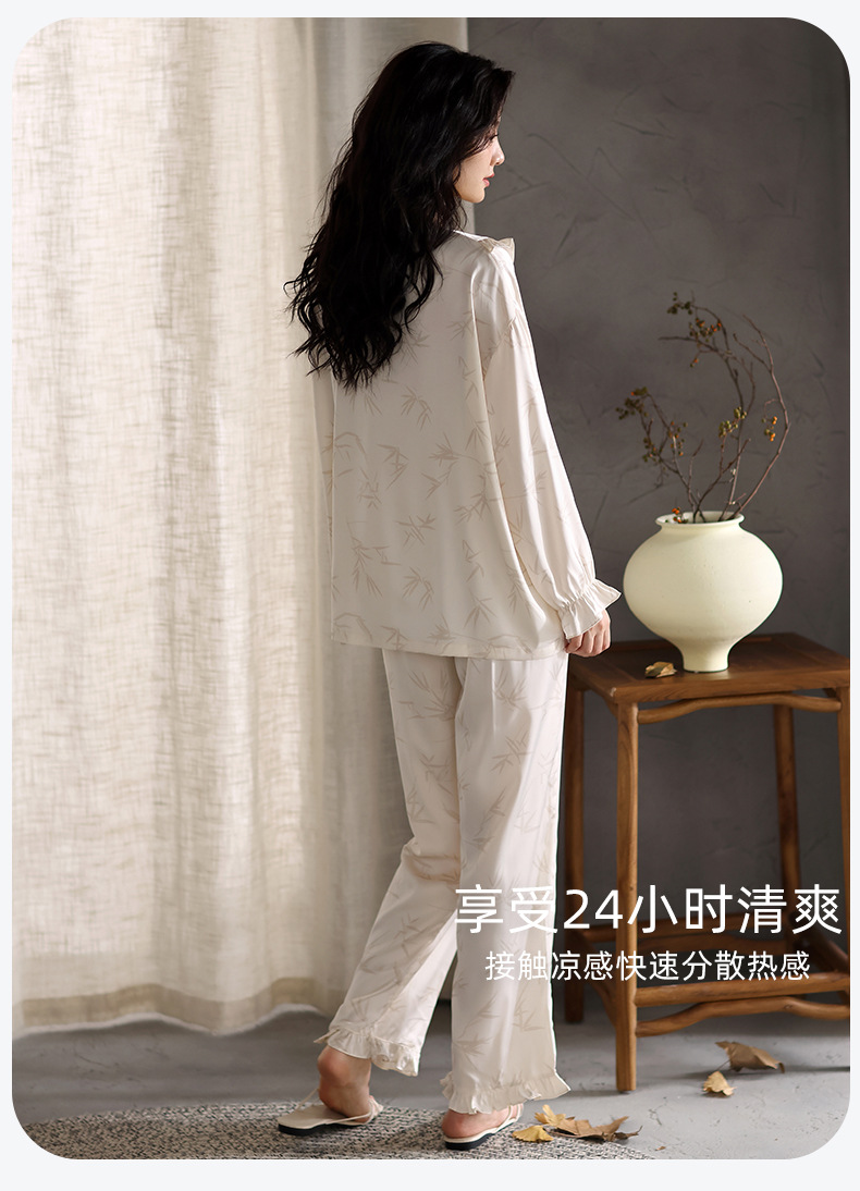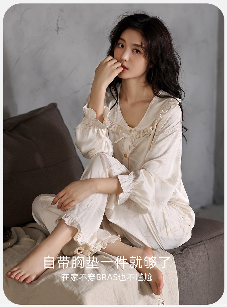 女士冰丝长袖带胸垫睡衣春秋季新款仿丝绸凉感娃娃领家居服套装